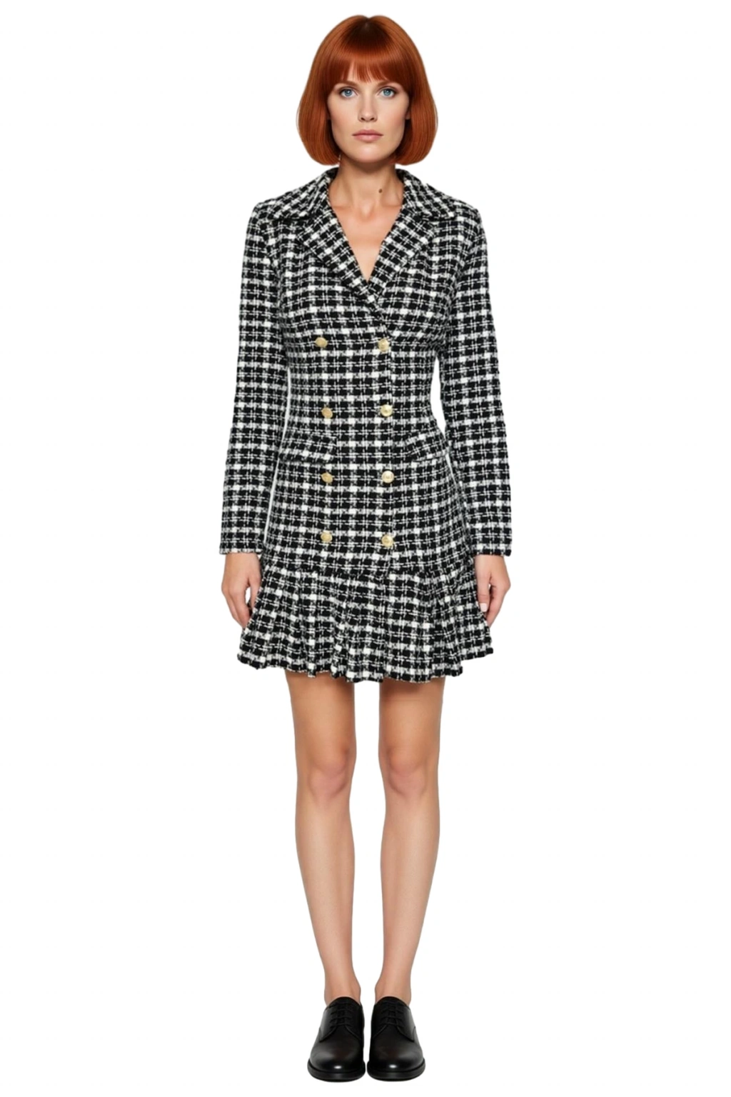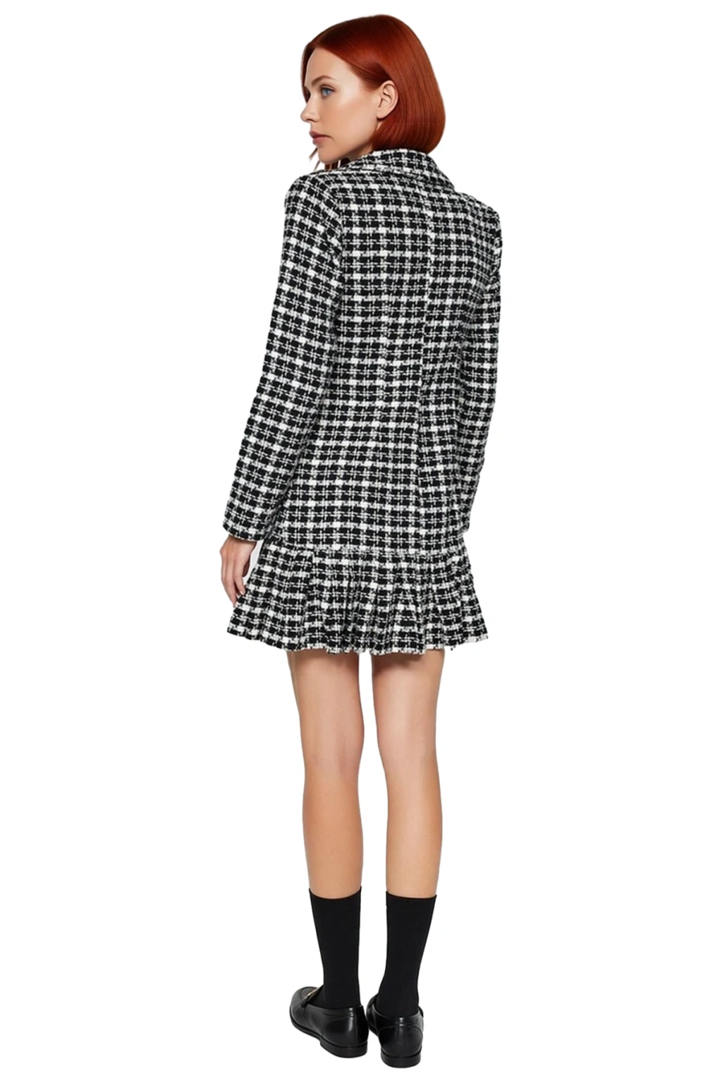 Bu elbisenin ceket yaka detayı, klasik ve otoriter bir görünüm kazandırırken, uzun standart kolları soğuk havalarda ideal bir koruma sağlar. Ön kısımda yer alan düğmeli kapama, elbiseye şık bir dokunuş katarken kolay giyim imkanı sunar. Fırfırlı mini etek ucu, hareketli ve feminen bir hava verirken, tüvit dokuma kumaşın benzersiz yapısı lüks bir his yaratır. Astarsız olmasına rağmen iç göstermez ve rahat bir kullanım sunar. Baskısız tasarımı sadeliği ön plana çıkarırken, kemersiz yapısıyla farklı kemerlerle kişiselleştirilebilir.