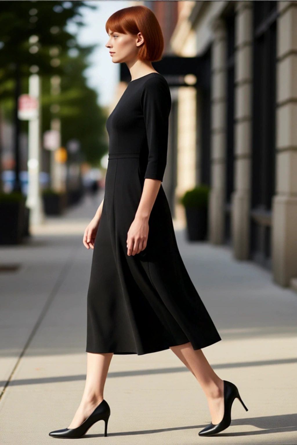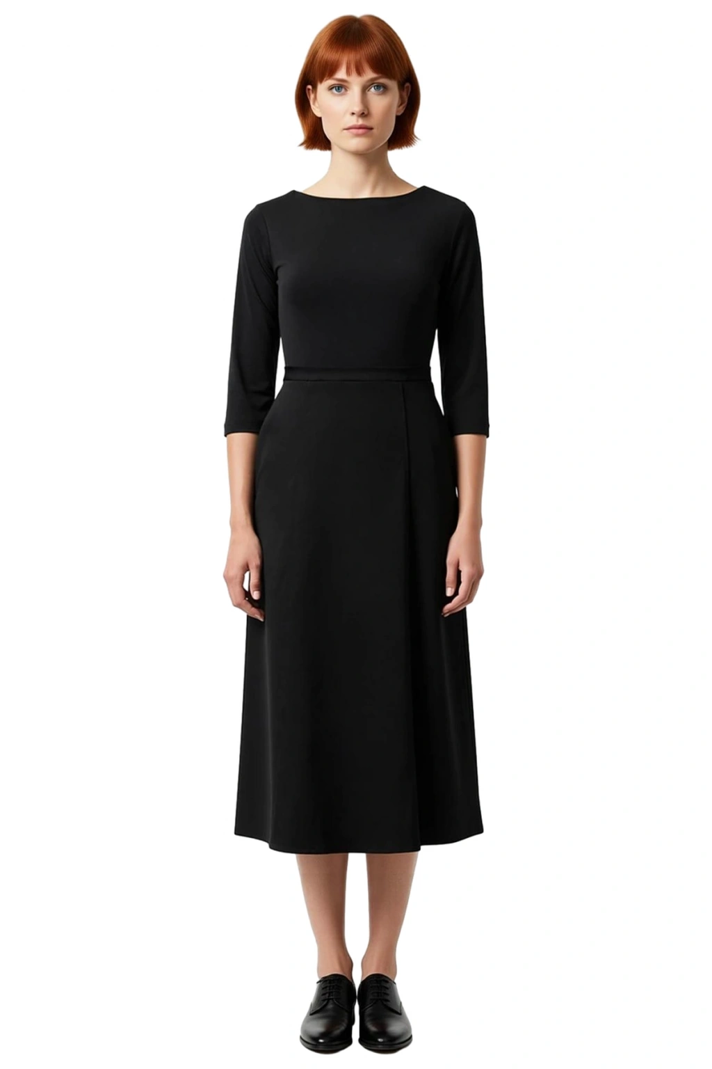 Ürün Özellikleri: Skater kalıp, %100 polyester materyal, düz desen, kayık yaka, 3/4 kol, standart kol, dokuma kumaş, siyah renk, cepli tasarım, midi boy, kemersiz.