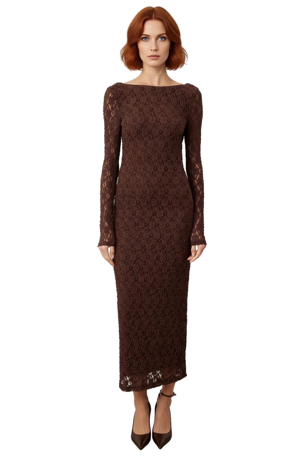 Ürün Özellikleri: Bodycon kalıp, %99 polyester %1 elastan materyal, düz desen, kayık yaka, standart kol, örme kumaş, kahverengi renk, astarlı tasarım.