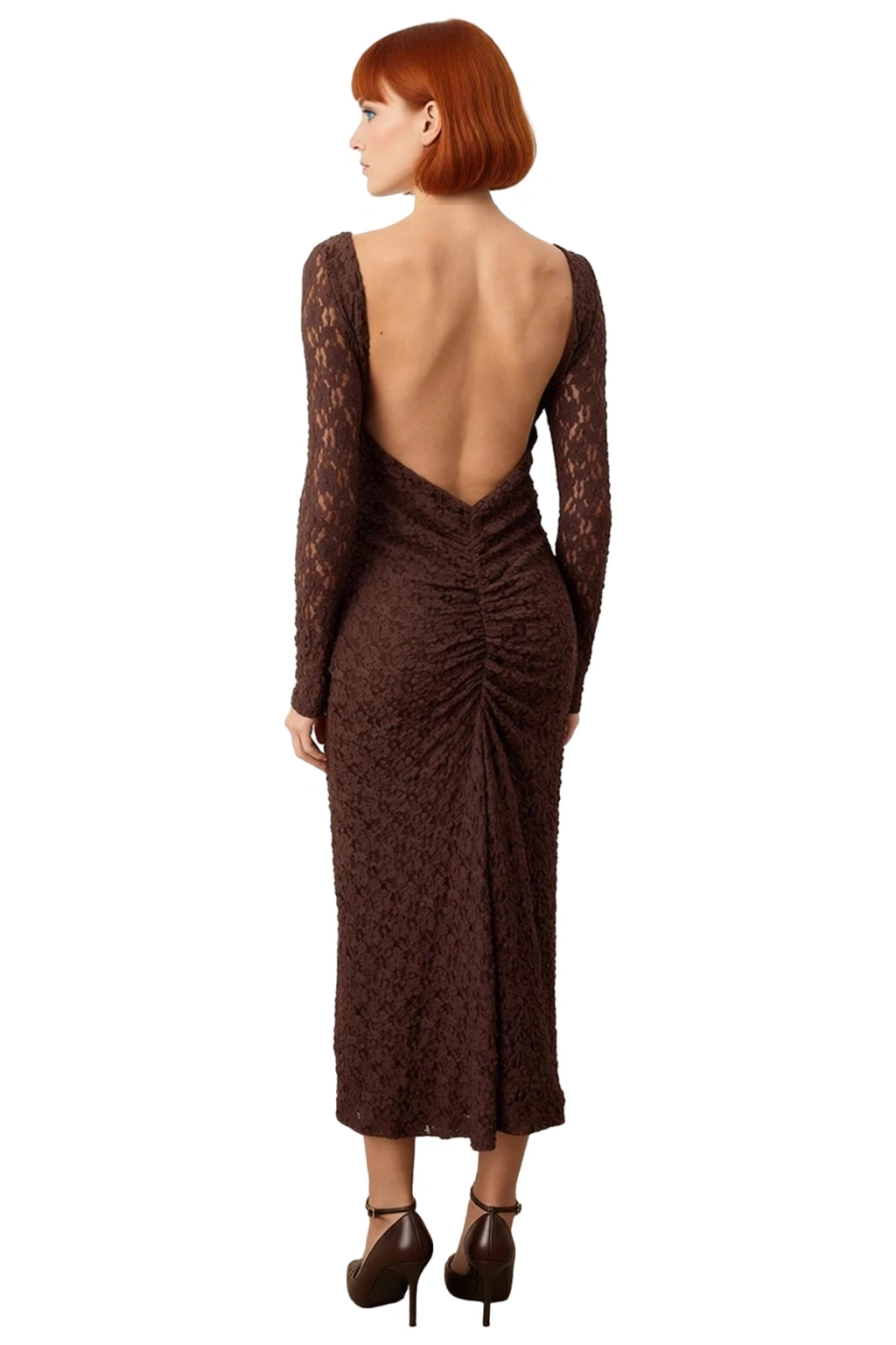Bu zarif kadın abiye elbisesi, Bodycon kesimi ile vücut hatlarınıza kusursuzca uyum sağlayarak büyüleyici bir görünüm sunar. Yüksek kaliteli %99 Polyester ve %1 Elastan materyal bileşimi, gün boyu esneklik ve rahatlık sağlarken, koyu kahverengi tonu asaletinizi vurgular. Astarlı tasarımı sayesinde konforlu bir kullanım sunan bu elbise, kış aylarının özel davetlerinde şıklığınızı tamamlamak üzere tasarlanmıştır. Dantel dokulu kumaşı, elbiseye derinlik ve sofistike bir hava katarken, düz deseni modern ve minimalist bir estetik sunar.