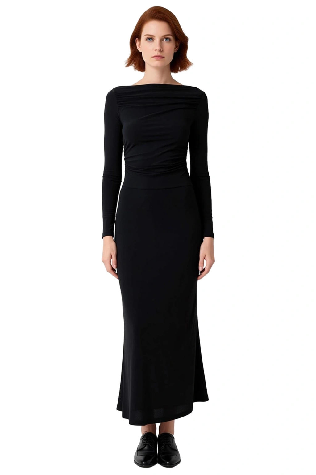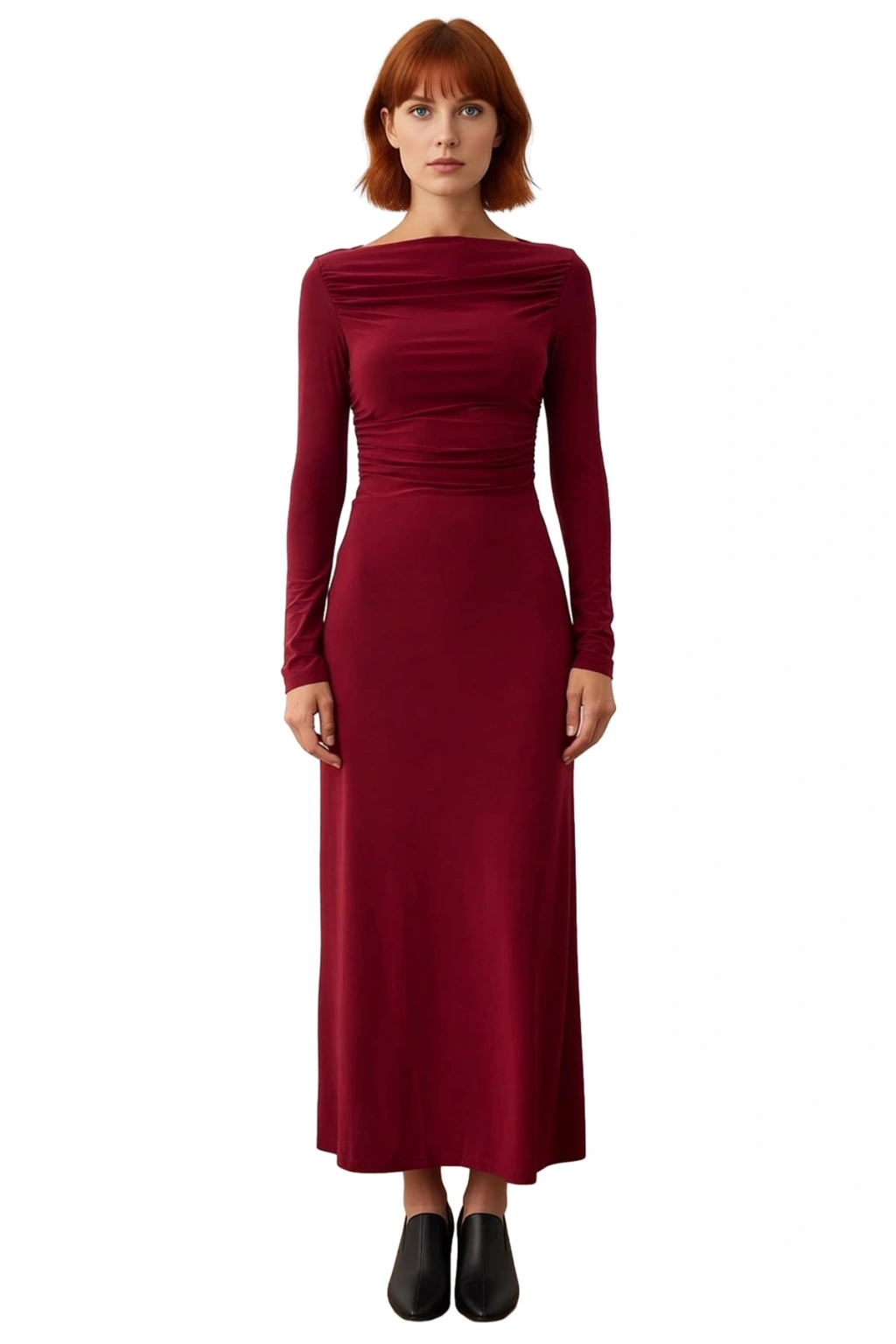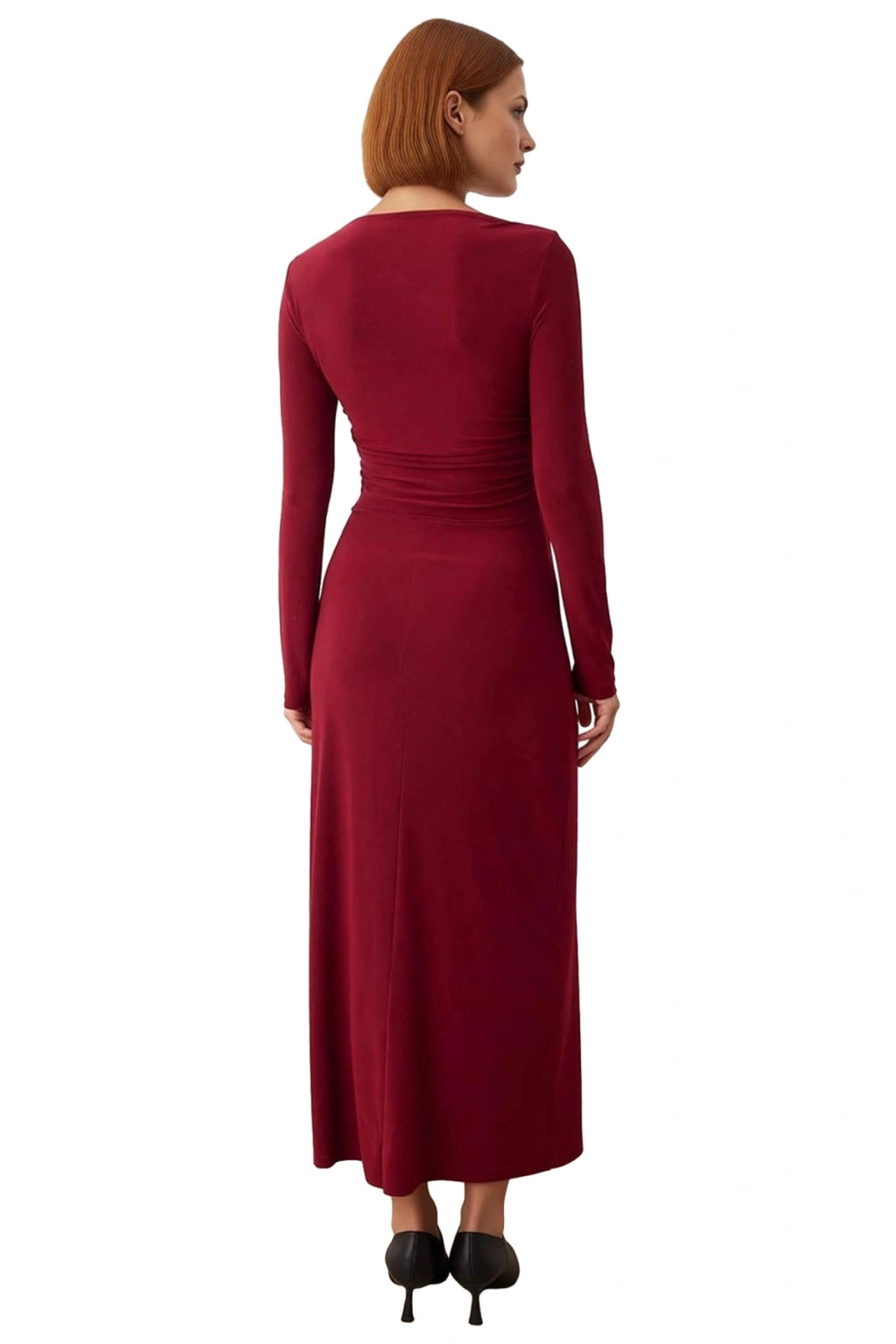 Ürün Özellikleri: Bodycon kalıp, polyester elastan materyal, düz desen, kayık yaka, standart kol, örme kumaş, bordo renk, büzgü detayı.