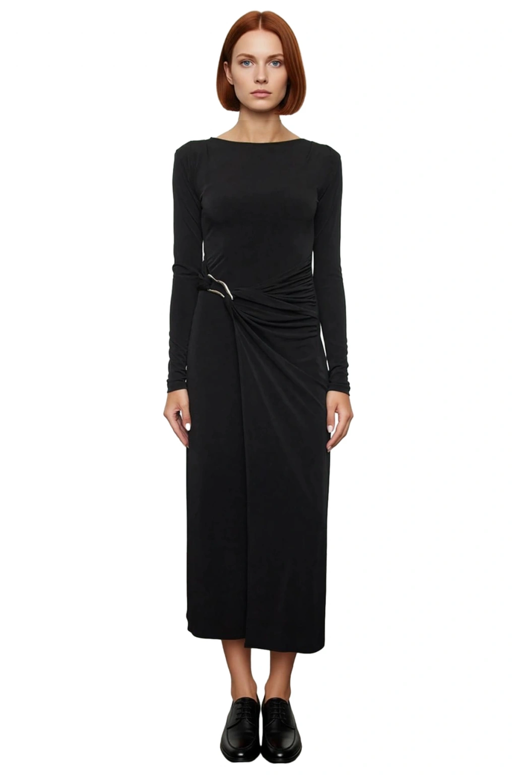 Kayık yaka tipi, omuzları zarifçe vurgulayarak sofistike bir görünüm yaratır. Düşük kol ve uzun kol boyu, hareket özgürlüğünü kısıtlamadan sıcaklık ve rahatlık sunar. Anvelop kapama şekli, elbiseye dinamik bir detay katarken, yürürken bacak dekoltesini nazikçe ortaya çıkarır. Astarsız olmasına rağmen Kalın Sandy örme kumaş yapısı sayesinde tok bir duruş sergiler ve kalitesini hissettirir. Bu elbise, Şık / Gece koleksiyonunun gözde parçalarından biri olup, uzun ömürlü kullanımıyla gardırobunuzdaki yerini alacaktır.