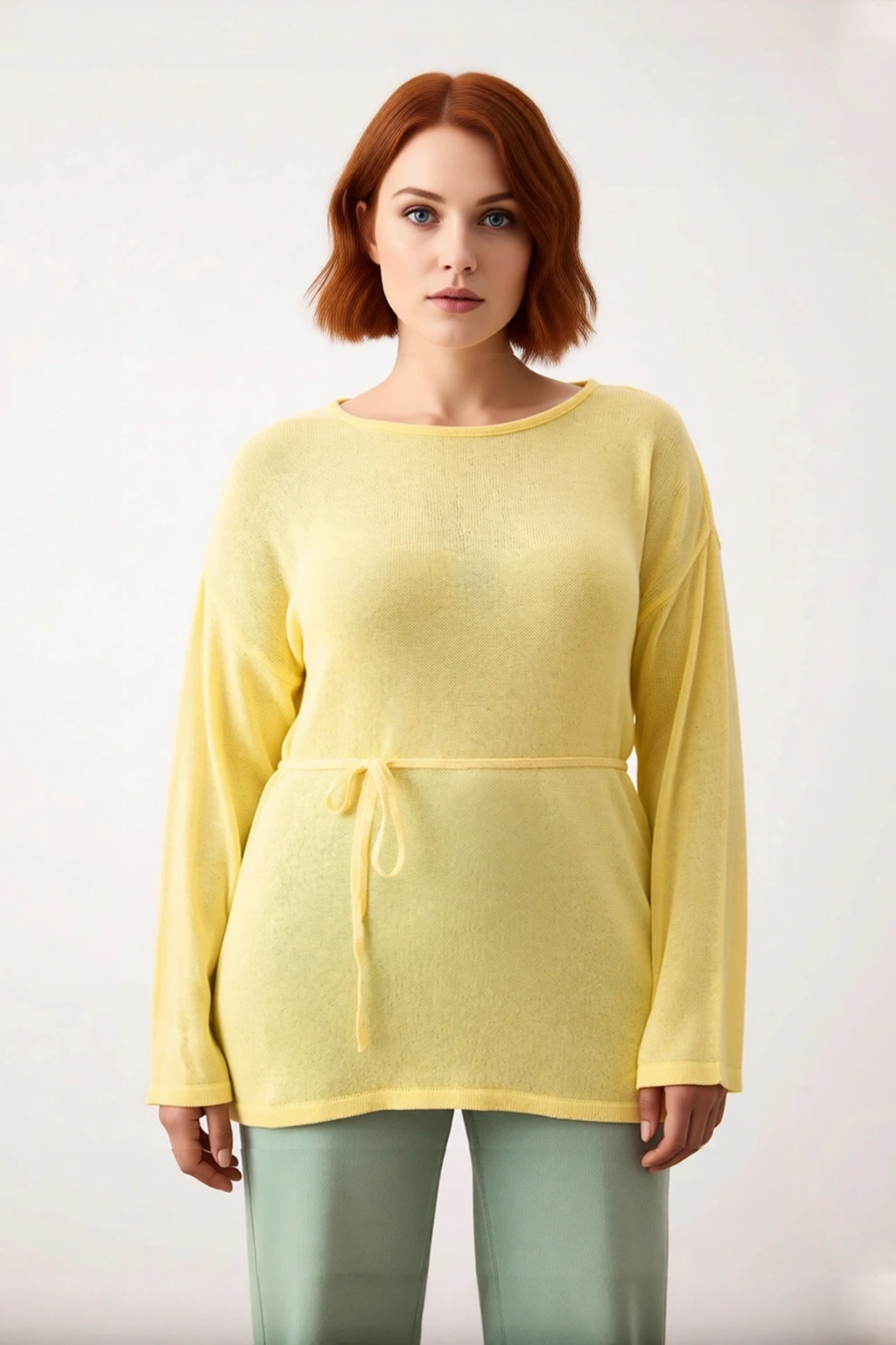 Bu şık ve modern kadın triko kazak, sarı rengi ve düz deseniyle ilkbahar ve sonbahar gardıroplarınızın vazgeçilmezi olacak. Regular kalıbı sayesinde vücuda tam oturmayan, rahat ve salaş bir duruş sergilerken, beli kuşaklı tasarımıyla istediğiniz zaman belinizi vurgulayabilir, farklı siluetler yaratabilirsiniz. Yüksek kaliteli %50 pamuk ve %50 polyester materyal bileşimi, gün boyu konfor ve nefes alabilirlik sunarak hafif ve yumuşak bir dokunuş hissi verir. İnce triko yapısı ve uzun boyuyla zarif duruşuyla kendinizi özel hissetmenizi sağlayacak.