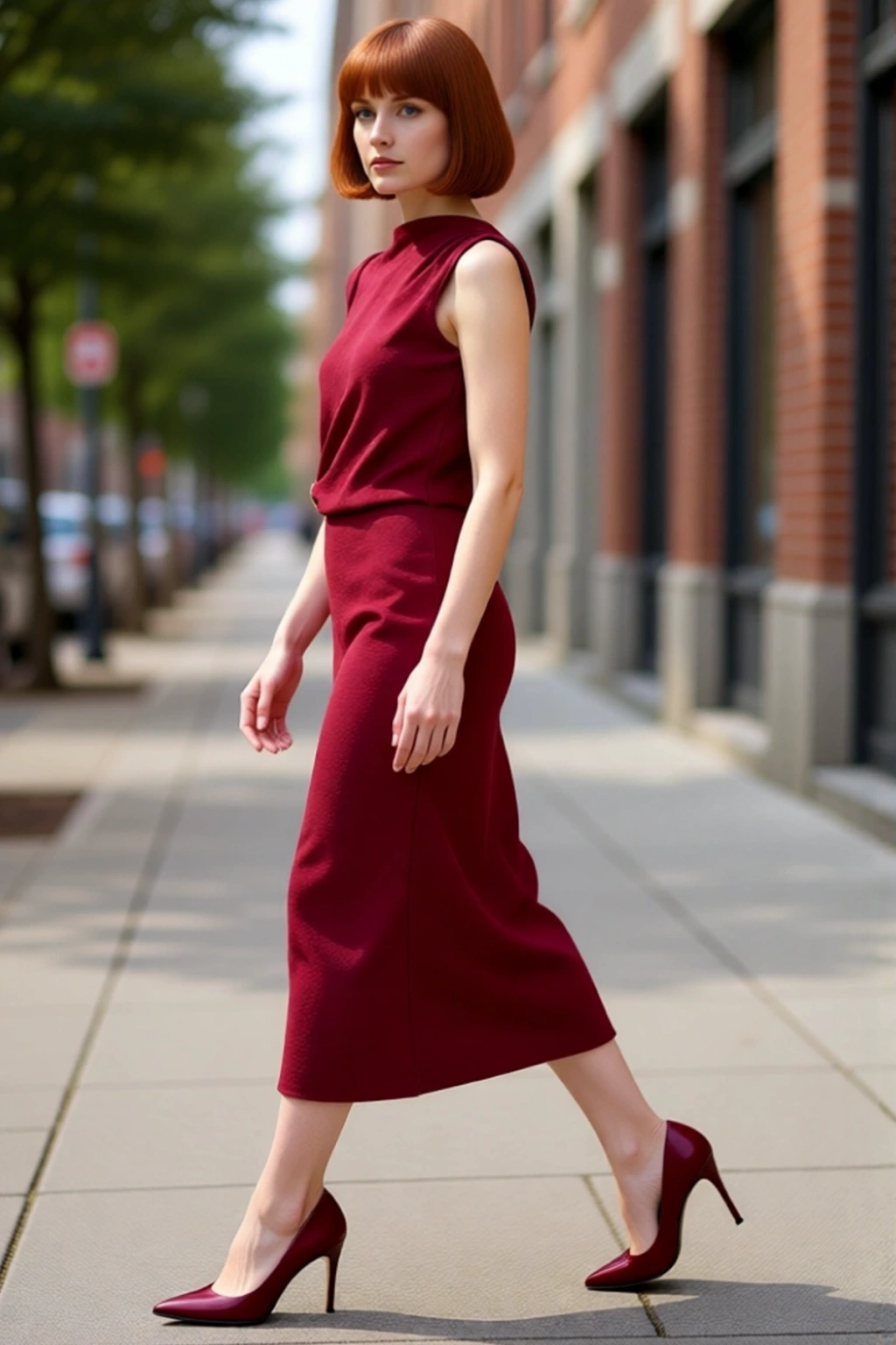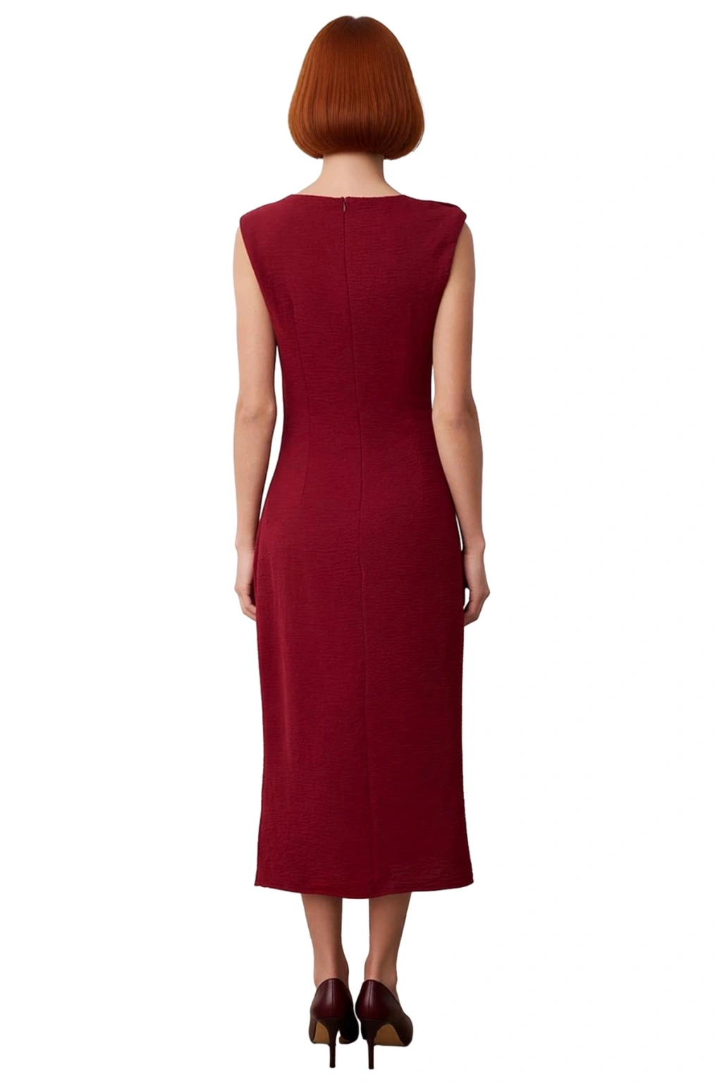 Ürün Özellikleri: Shift kalıp, %100 polyester materyal, düz desen, kayık yaka, kolsuz, dokuma kumaş, bordo renk, astarlı tasarım.