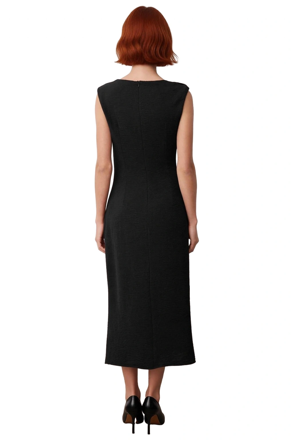 Omuzları ve boyun hattını zarifçe çerçeveleyen kayık yaka tasarımı, kolsuz kesimiyle birleşerek özellikle ılık ilkbahar ve sonbahar günlerinde ferah bir kullanım sunar. Aerobin dokuma kumaşının hafif kırışık dokusu, elbiseye hareketli ve modern bir hava katarken, astarlı yapısı sayesinde kullanım esnasında tam bir rahatlık ve güven sağlar. Midi boyu, hem günlük kullanım hem de özel davetler için uygun bir denge sunar. Makinede yıkanabilir %100 polyester kumaşı sayesinde pratik ve uzun ömürlüdür.