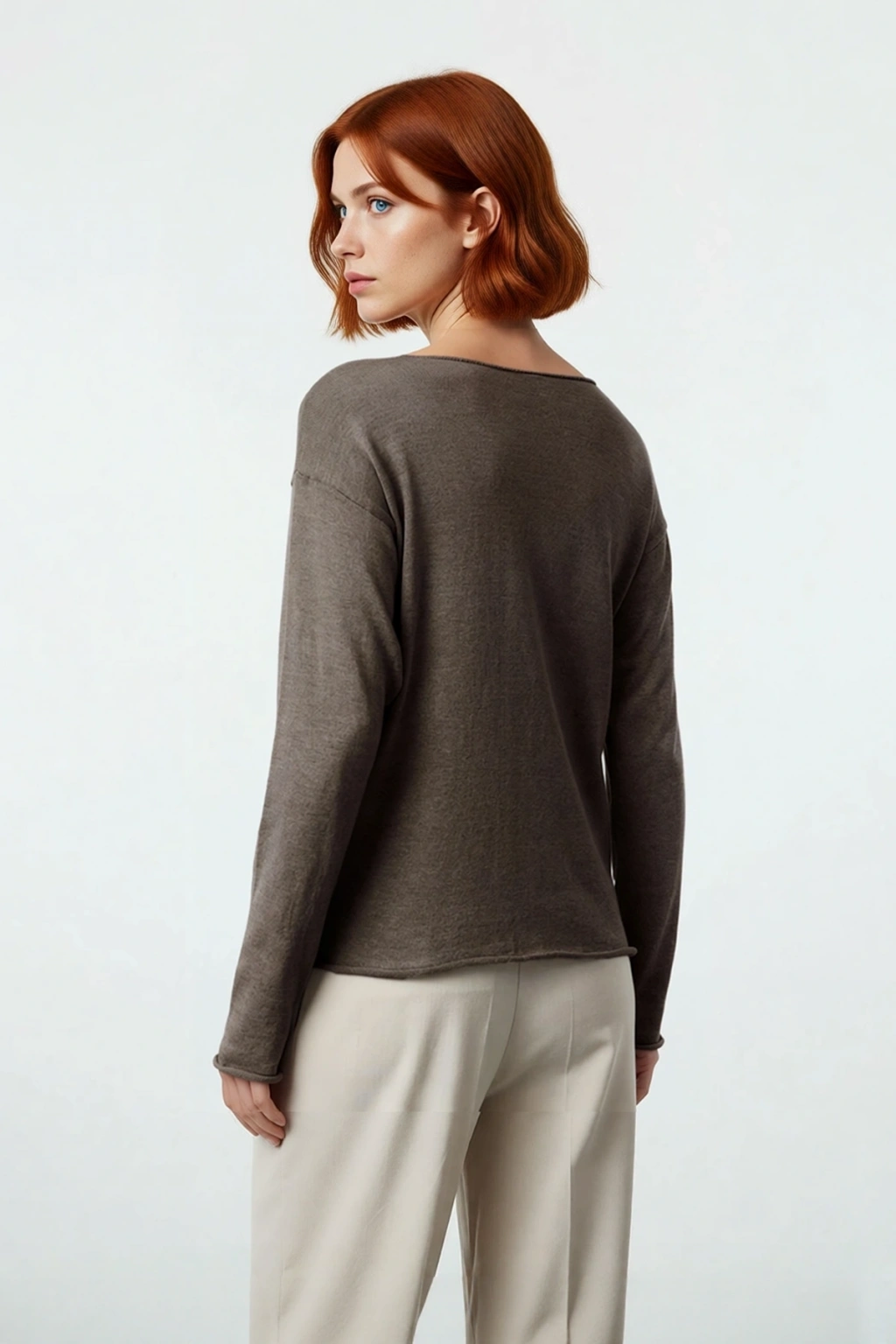 Ürün Özellikleri: Regular kalıp, akrilik pamuk karışım materyal, düz desen, kayık yaka, standart uzun kol, triko kumaş, gri renk.