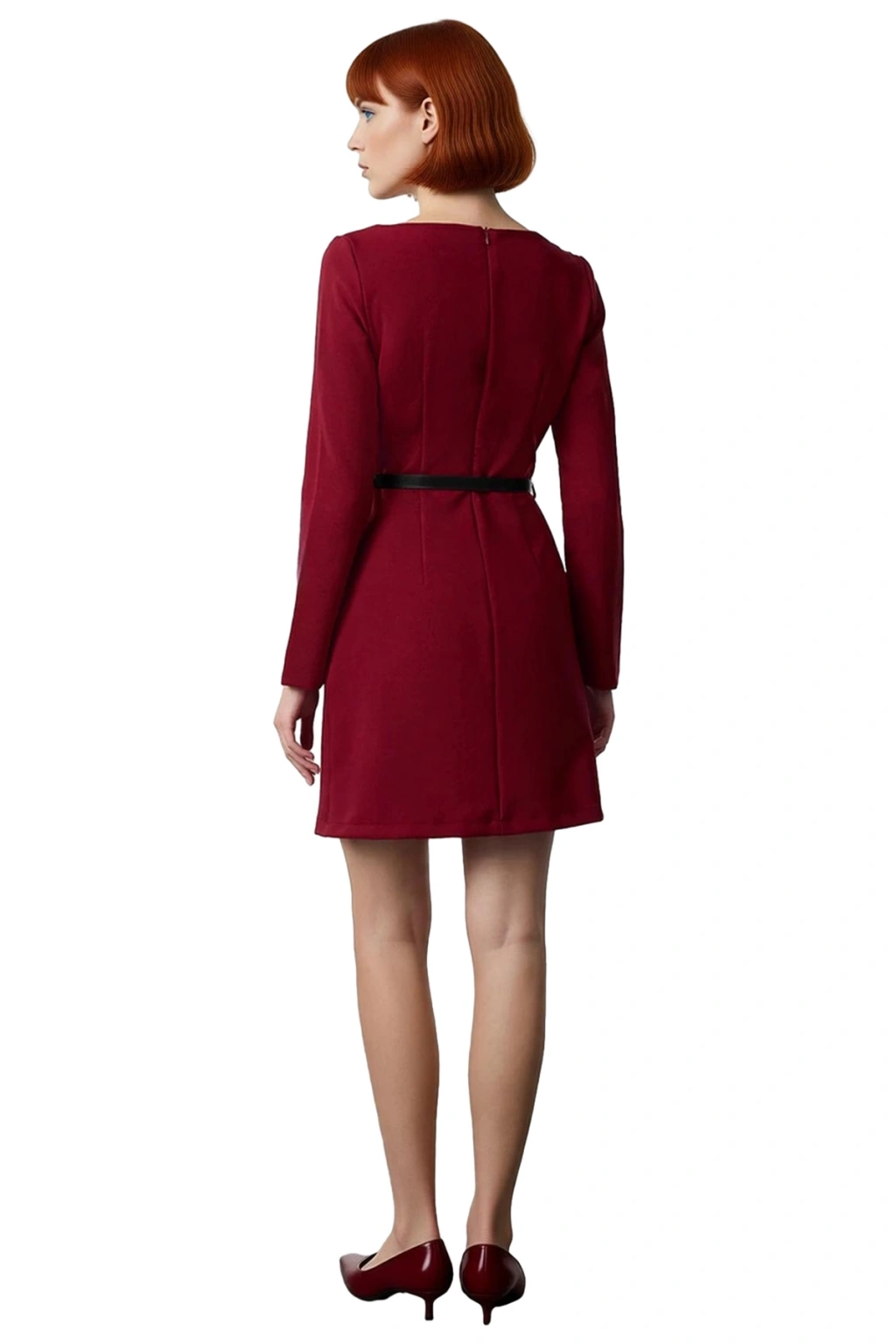 Ürün Özellikleri: A-line kalıp, polyester karışımlı materyal, düz desen, kayık yaka, uzun standart kol, dokuma kumaş, bordo renk, kemerli mini boy.