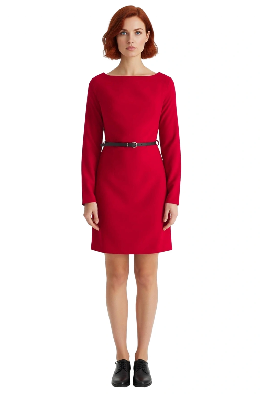 Ürün Özellikleri: A-line kalıp, polyester karışımlı materyal, düz desen, kayık yaka, uzun standart kol, dokuma kumaş, bordo renk, kemerli mini boy.