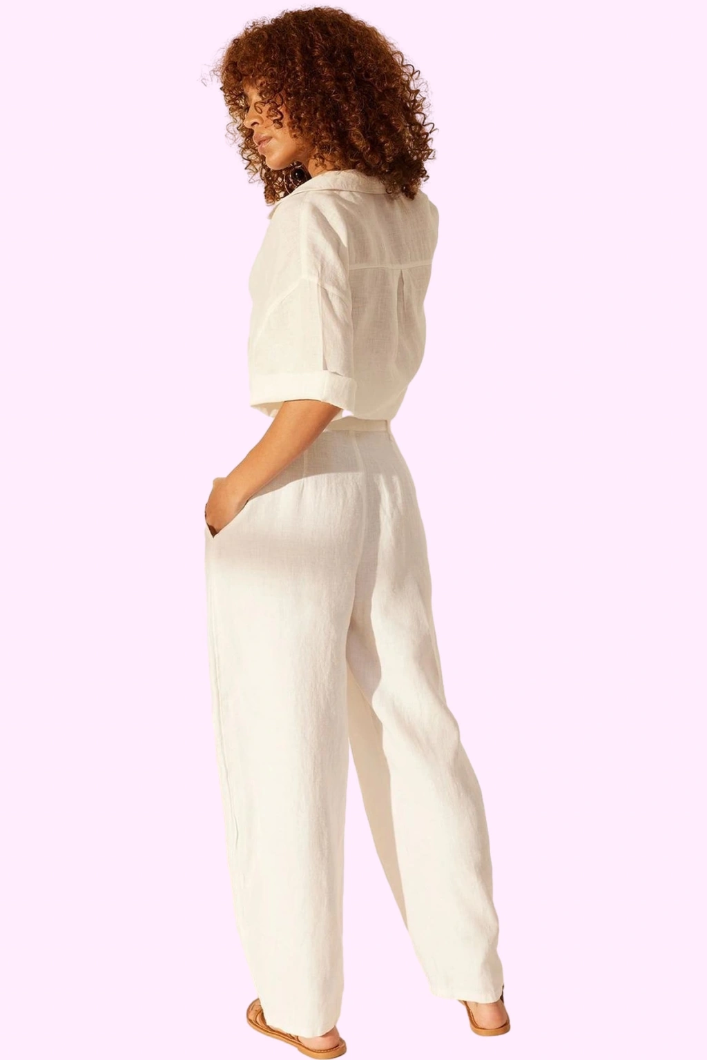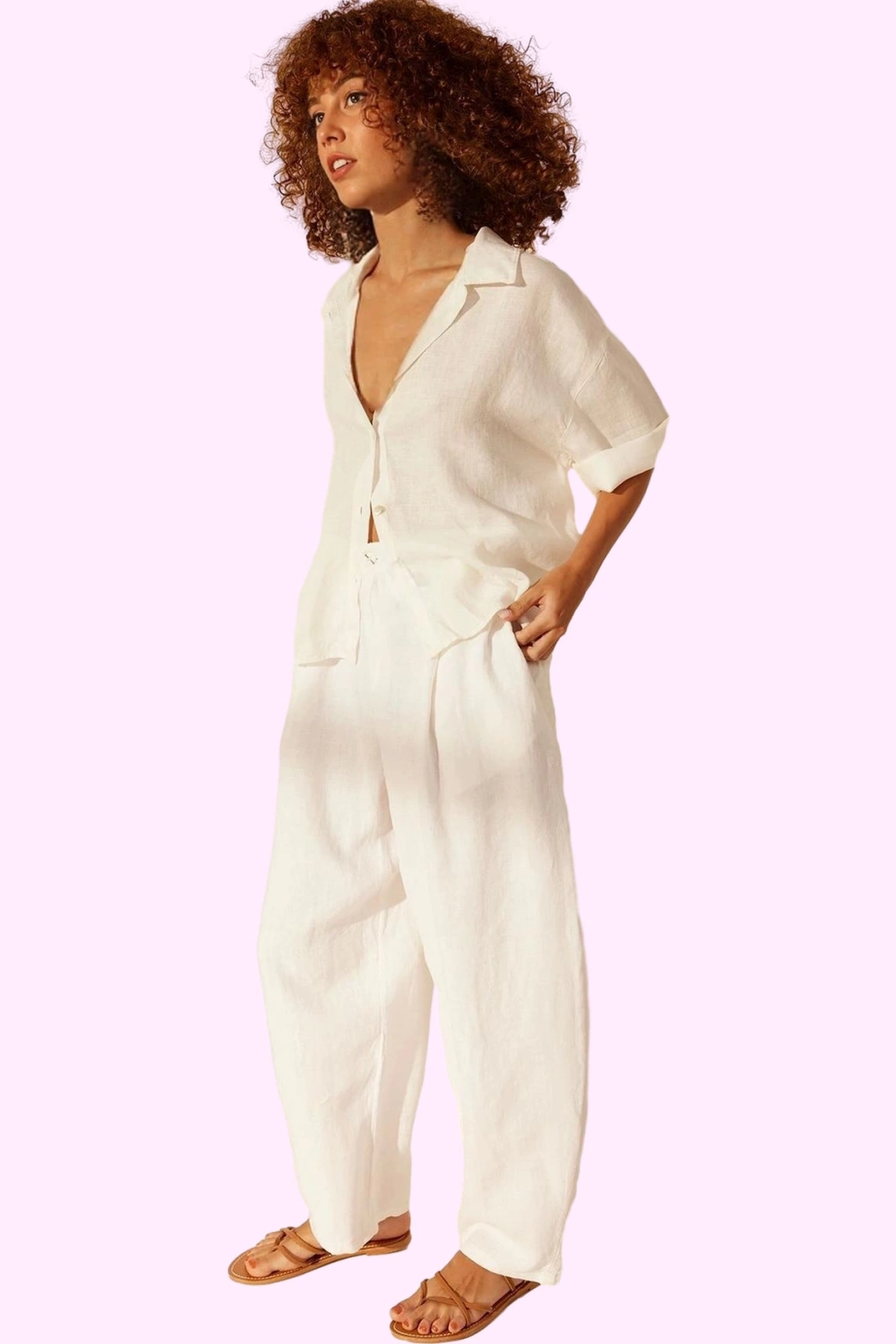 Materyal: Keten; Kumaş Tipi: Dokuma; Paça Tipi: Geniş Paça; Bel: Yüksek Bel; Kalıp: Wide Leg; Desen: Düz; Renk: Beyaz; Cep: Cepsiz; Astar Durumu: Astarsız; Boy: Uzun; Siluet: Boyfriend; Ortam: Casual/Günlük; Dokuma Tipi: Rigid; Persona: Fashion Forward; Kemer/Kuşak Durumu: Kemersiz; Sürdürülebilirlik Detayı: Hayır; Materyal Bileşeni: 100% Keten; Yıkama Talimatı: T01; Sezon: Yaz; Menşei: TR