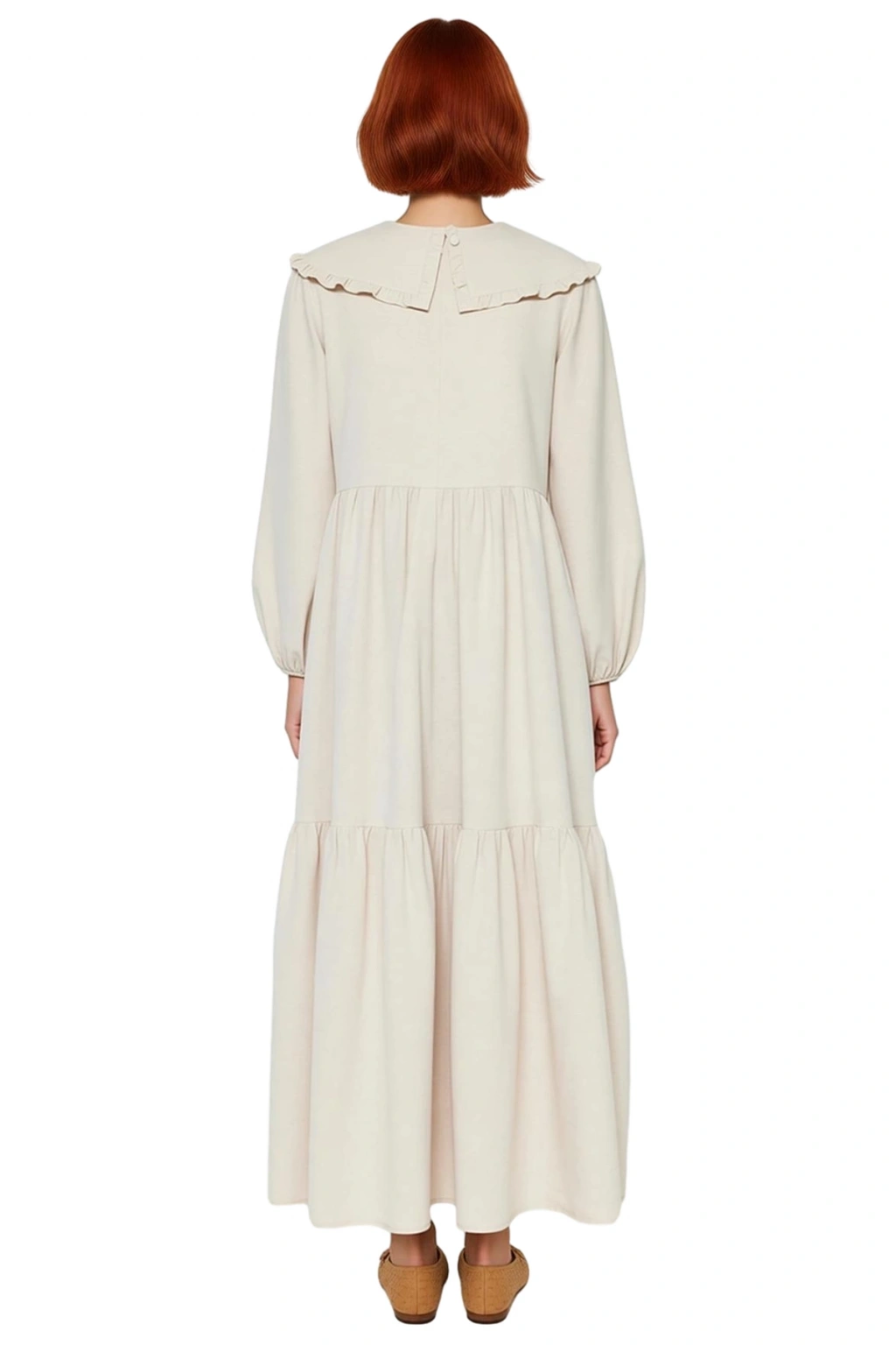 Bu kadın keten görünümlü dokuma maxi elbise, zarif bebe yaka ve dikkat çekici nakış detaylarıyla sofistike bir stil sunar. Shift kalıbı sayesinde her bedene uyum sağlayarak özgür ve rahat bir giyim deneyimi vaat eder. Krem rengi, doğal ve huzurlu bir hava katarken, ilkbahar ve sonbaharın ruhunu yansıtan ideal bir tercihtir. Düz deseni üzerindeki narin nakışlar, elbiseye feminen bir dokunuş katarken, casual ortamlarda bile şıklığınızdan ödün vermemenizi sağlar.