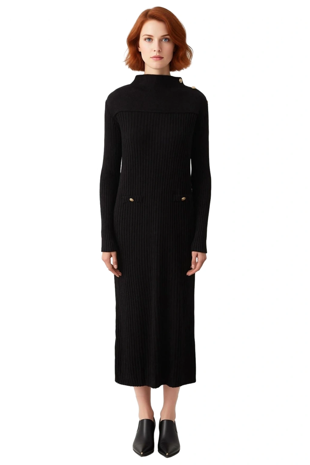 Ürün Özellikleri: A-line kalıp, %100 akrilik materyal, düz desen, dik yaka, uzun kol, triko kumaş, siyah renk, ribana/kaşkorse dokuma tipi, maxi boy, astarsız.
