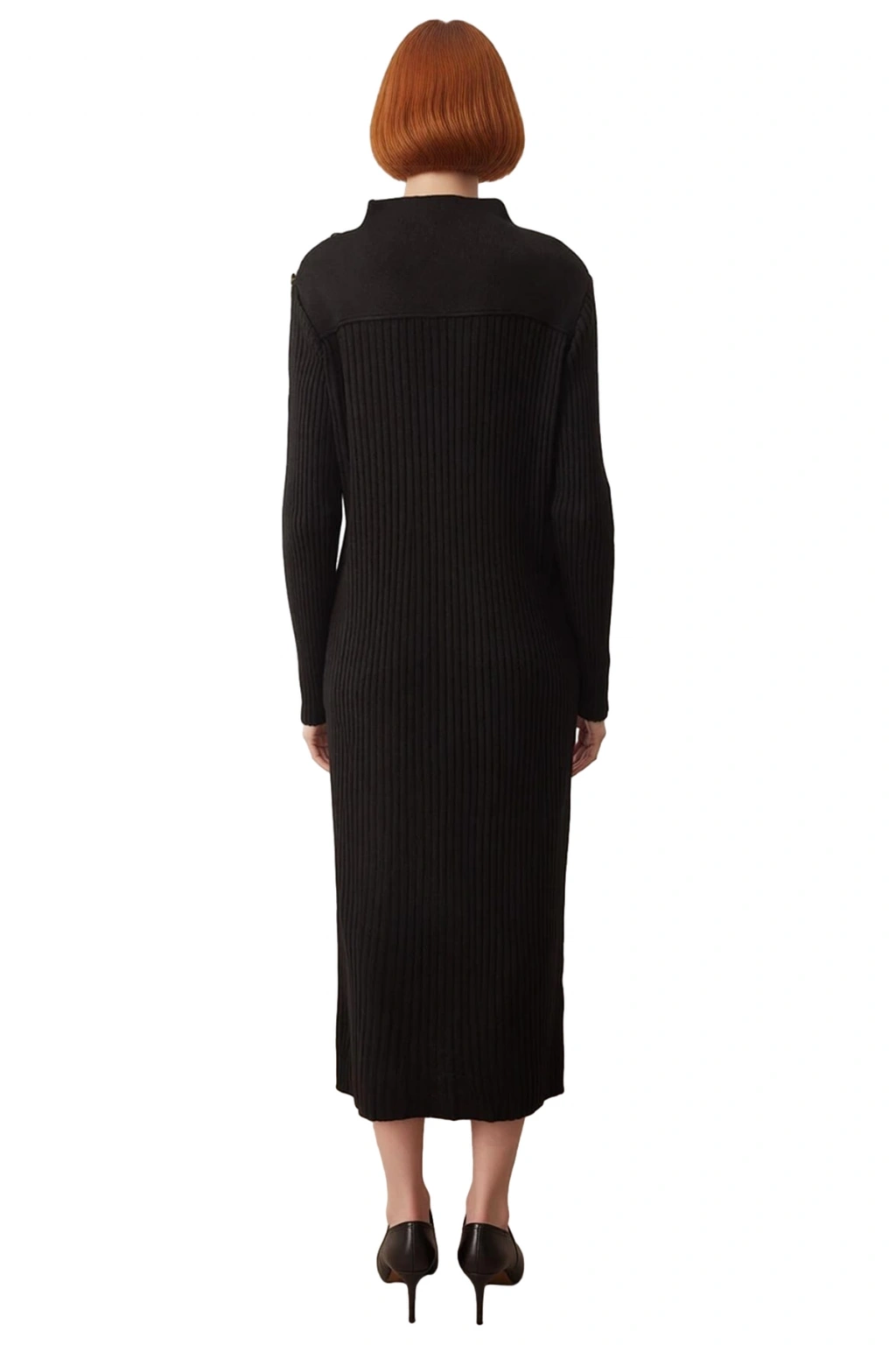 Ürün Özellikleri: A-line kalıp, %100 akrilik materyal, düz desen, dik yaka, uzun kol, triko kumaş, siyah renk, ribana/kaşkorse dokuma tipi, maxi boy, astarsız.