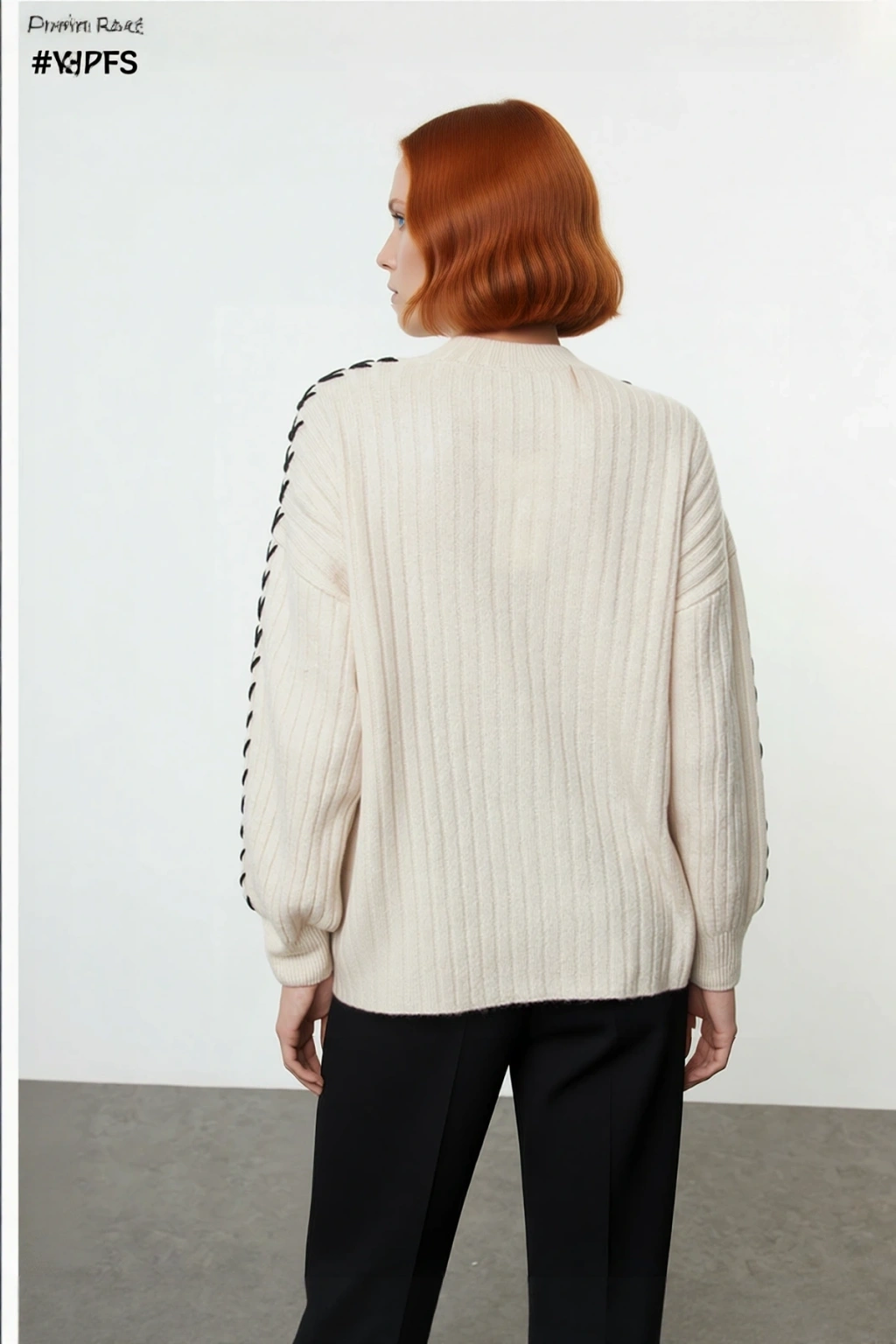 Ürün Özellikleri: Oversize kalıp, akrilik materyal, nakışlı / işlemeli desen, dik yaka, düşük kol, triko kumaş, bej renk.