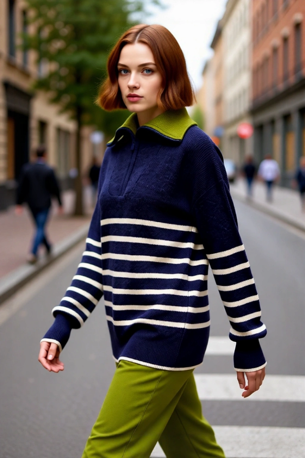 Kadın kışlık giyim koleksiyonunun en dikkat çekici parçalarından biri olan bu geniş kalıp triko kazak, soğuk havalarda bile sıcak ve stil sahibi bir görünüm sunar. Yüksek kaliteli akrilik, polyester ve poliamid liflerinden oluşan materyal karışımı, üstün yumuşaklık ve ısı yalıtımı sağlayarak gün boyu konfor vadeder. Lacivert ana rengi üzerindeki klasik ve modern çizgili deseni, her ortama uyum sağlayan zamansız bir şıklık yaratır. Yaka içindeki kontrast yeşil renk detayı, kazaka enerjik bir dokunuş katar ve tarzınızı öne çıkarır.