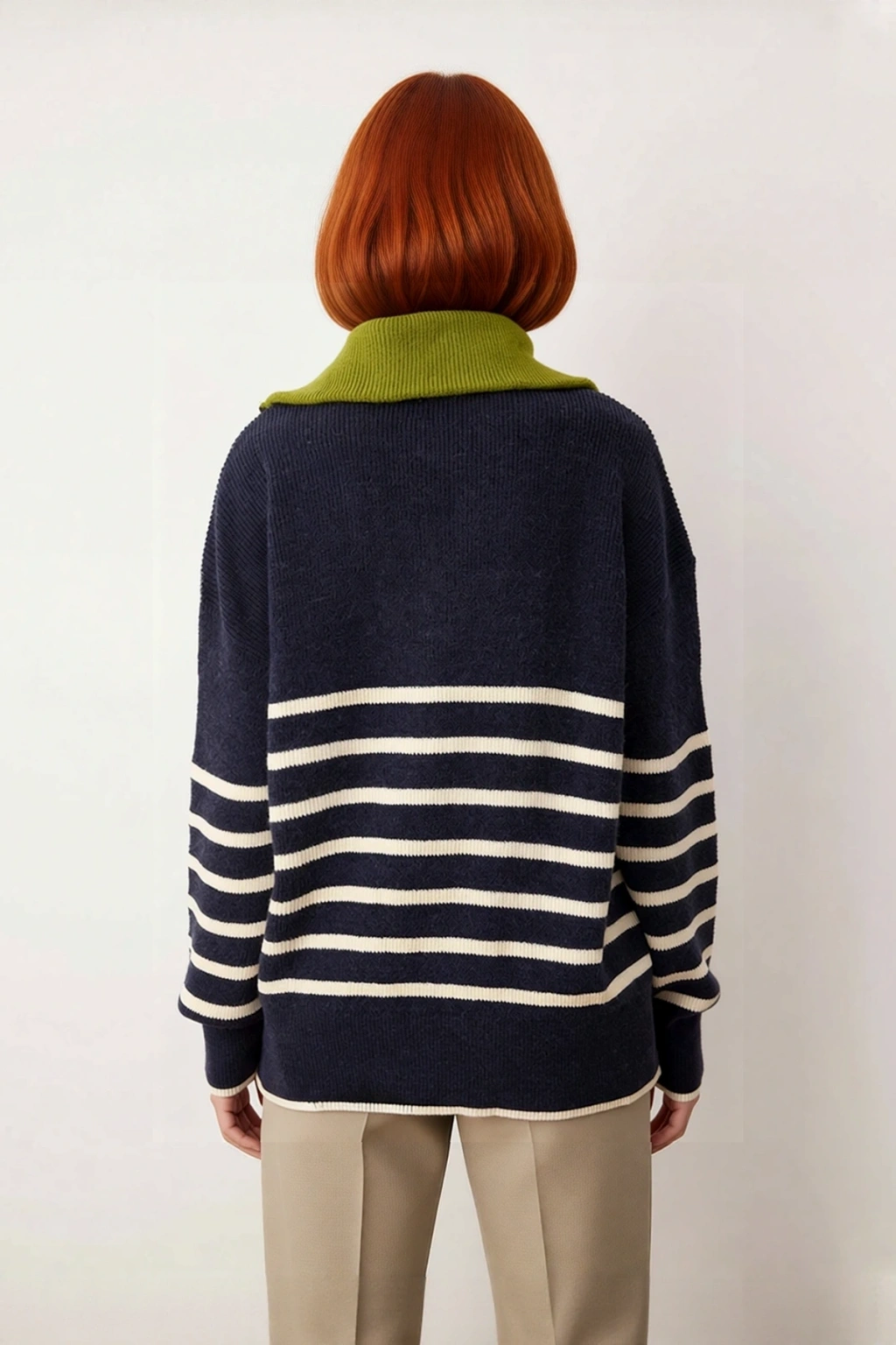Ürün Özellikleri: Geniş kalıp, akrilik karışımlı materyal, çizgili desen, devrik yaka, düşük kol, triko kumaş, lacivert renk.