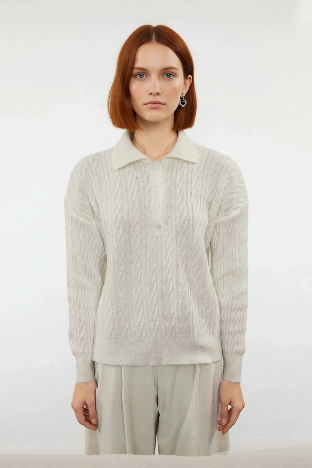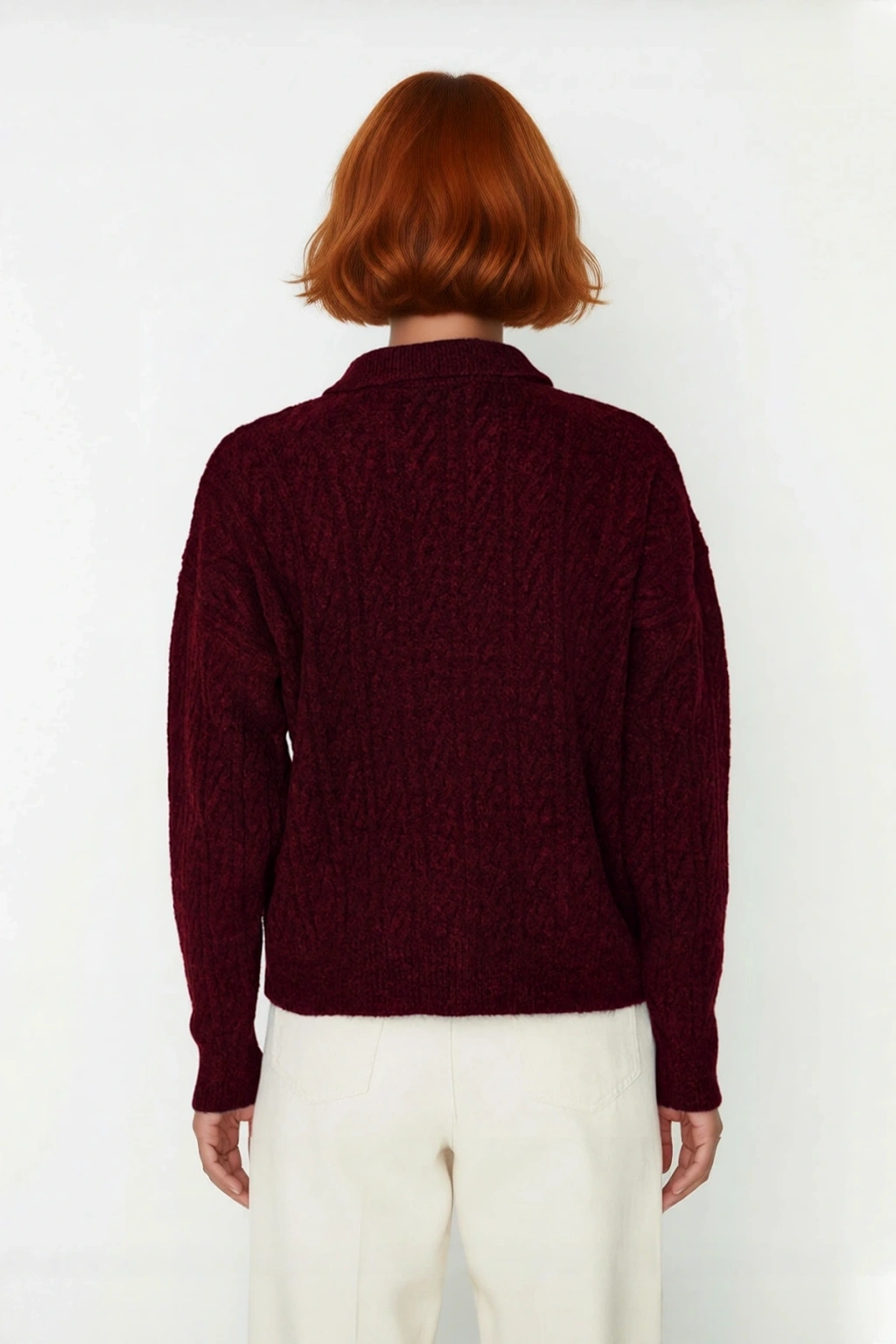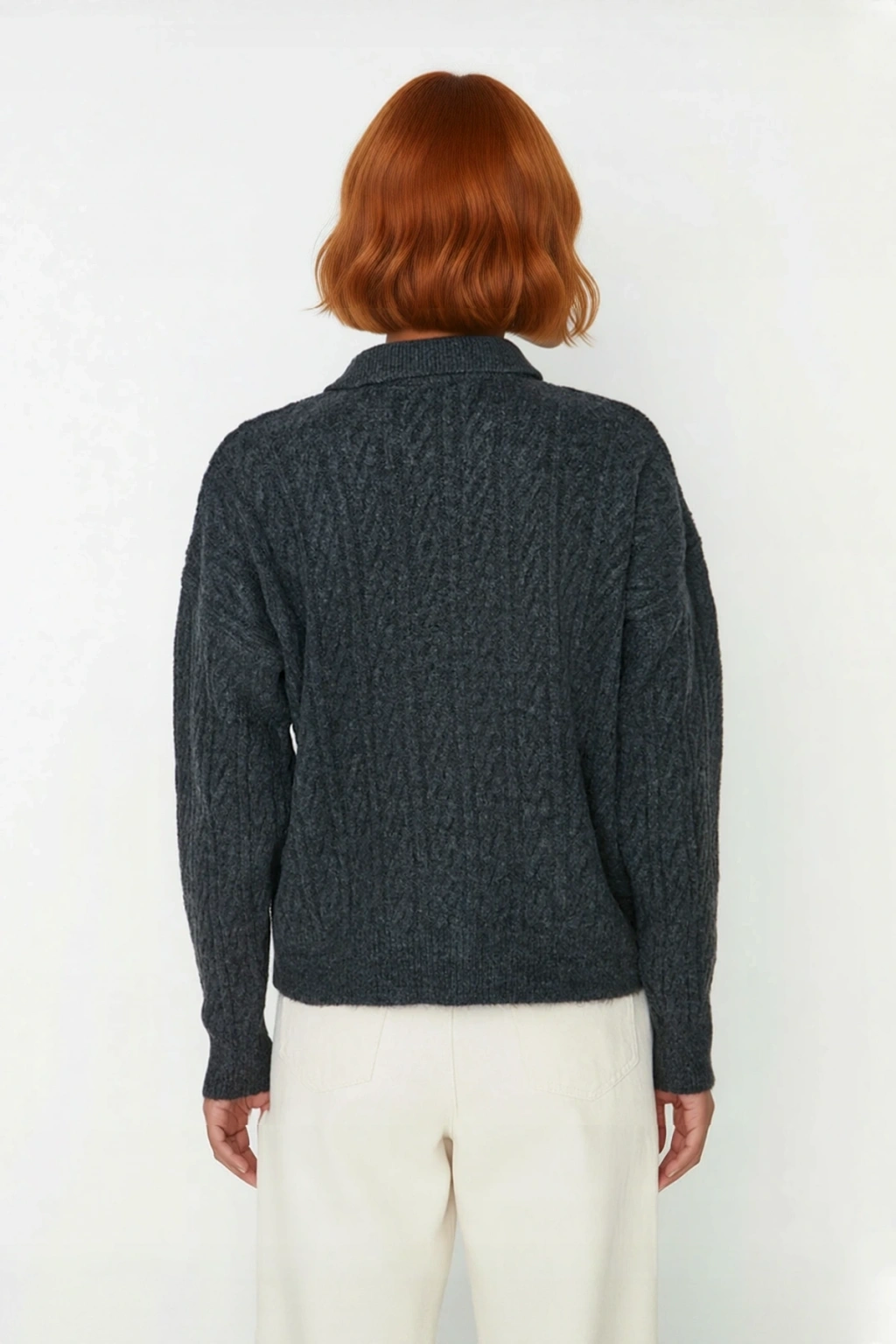 Ürün Özellikleri: Oversize kalıp, 74% akrilik 26% polyester materyal, saç örgü desen, polo yaka, düşük uzun kol, triko kumaş, gri renk, basic siluet.
