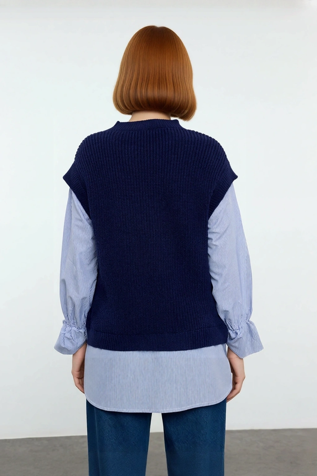 Ürün Özellikleri: Regular kalıp, poliamid karışımlı materyal, düz desen, bisiklet yaka, kolsuz, triko kumaş, lacivert renk, baskısız tasarım.