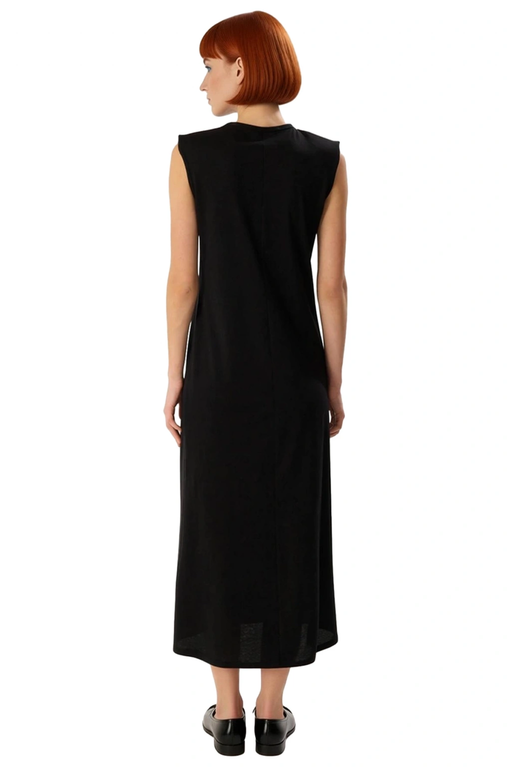 Ürün Özellikleri: A-line kalıp, pamuk materyal, düz desen, bisiklet yaka, kolsuz kol, örme kumaş, siyah renk.