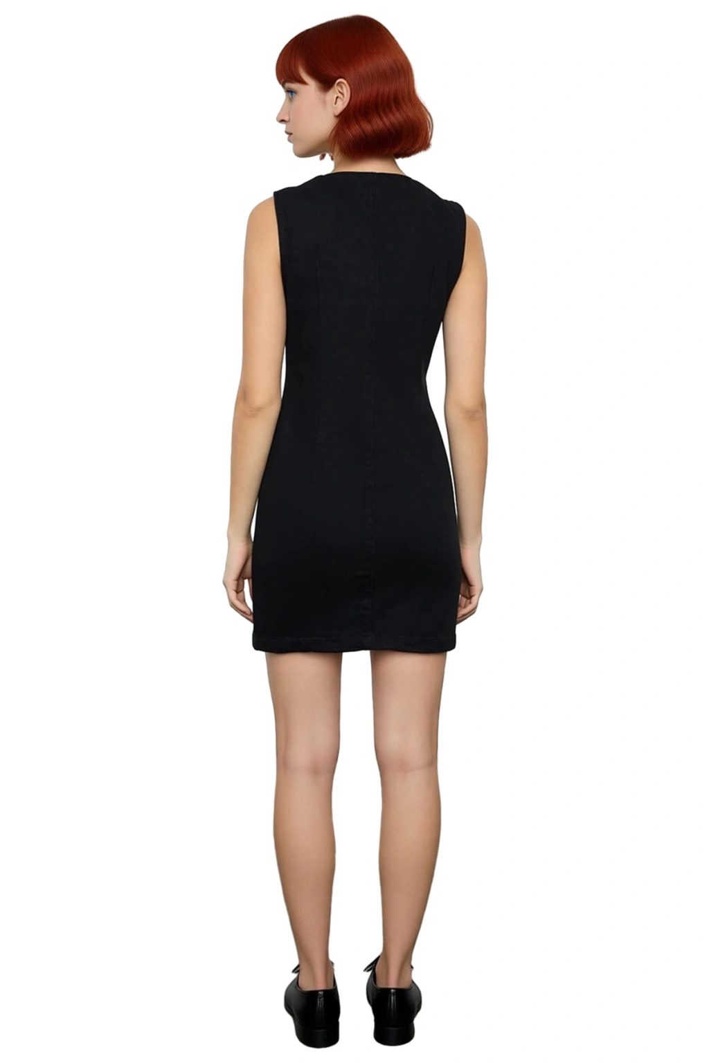 Ürün Özellikleri: Kruvaze kalıp, denim materyal, düz desen, bisiklet yaka, kolsuz, rigid kumaş, siyah renk, düğmeli kapama.