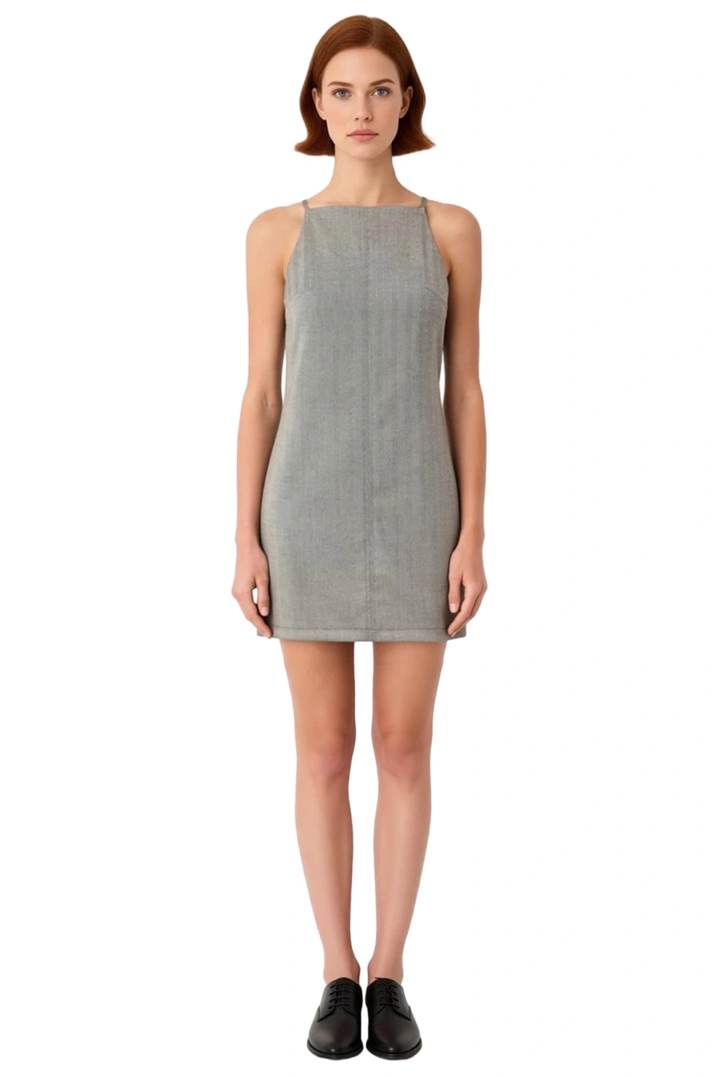 Ürün Özellikleri: Shift kalıp, poliviskon materyal, kazayağı desen, halter yaka, kolsuz kol, dokuma kumaş, gri renk, mini boy.