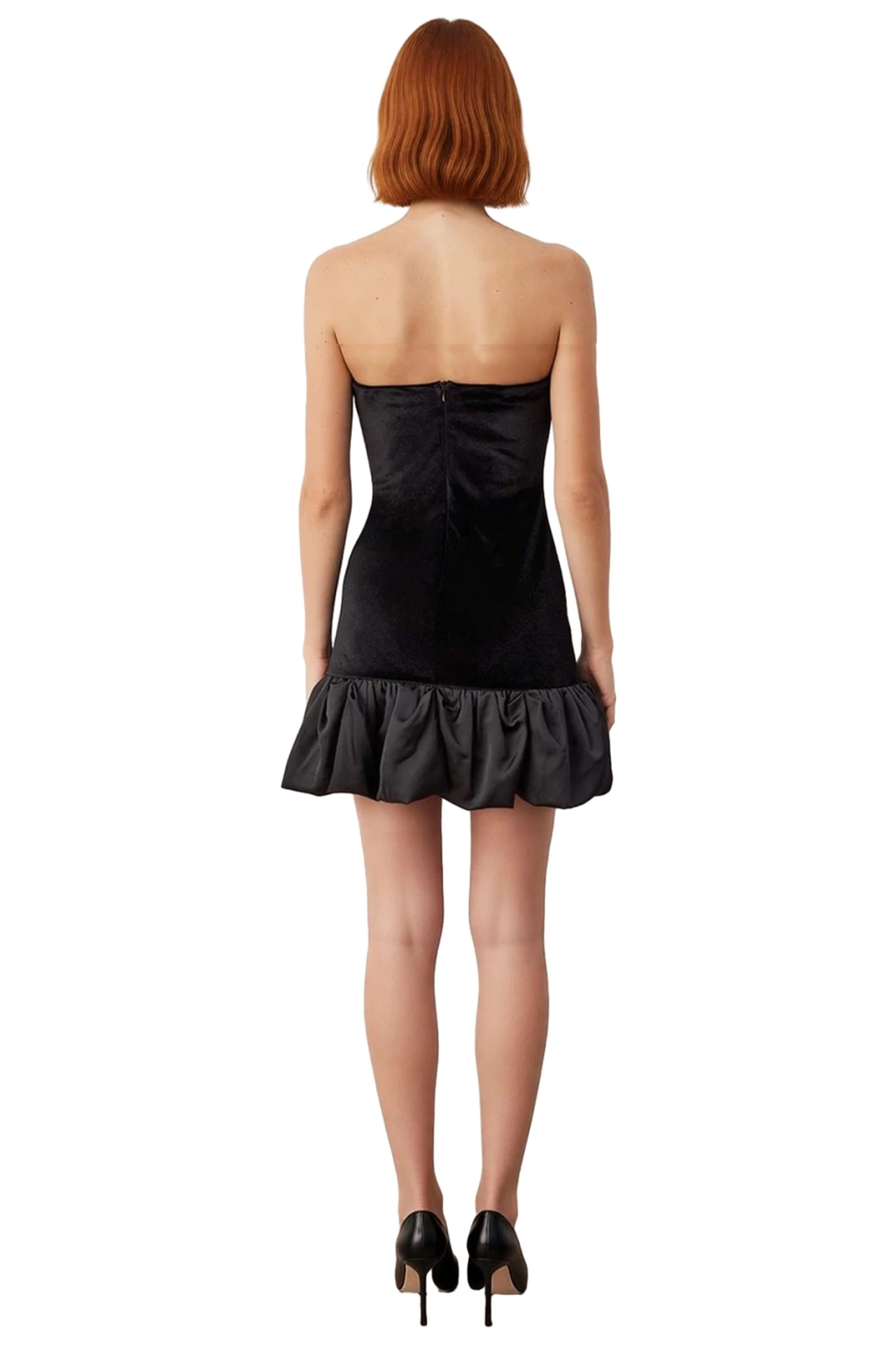 Bu etkileyici kadın mini elbise, göz alıcı straplez tasarımı ve zarif kadife kumaşıyla özel anlarınıza ışıltı katıyor. Skater kalıbı, feminen hatları vurgularken, kolsuz yapısı modern ve çekici bir duruş sergiler. Siyah rengin asil duruşu ve düz deseni, elbiseyi zamansız bir parça haline getirir. Eteğindeki saten balon detayı, hareketli ve özgün bir stil yaratırken, kadife üst kısmı lüks bir his sunar. Bu elbise ile her ortamda şıklığınızdan ödün vermeyin ve tarzınızı konuşturun.