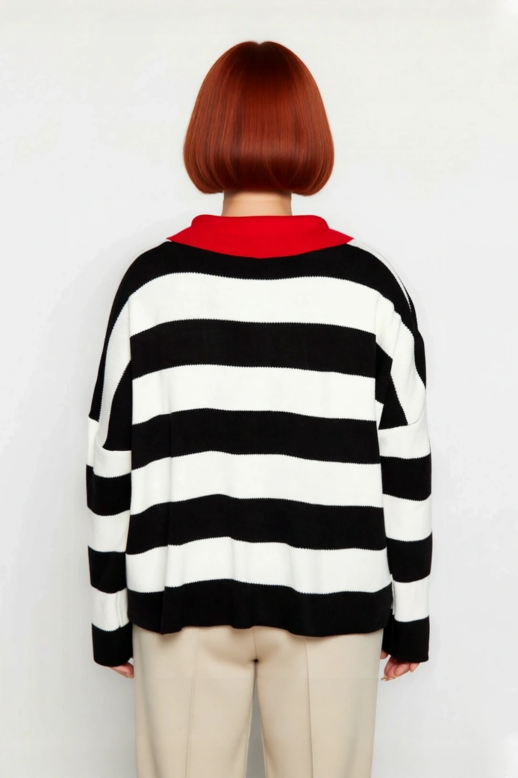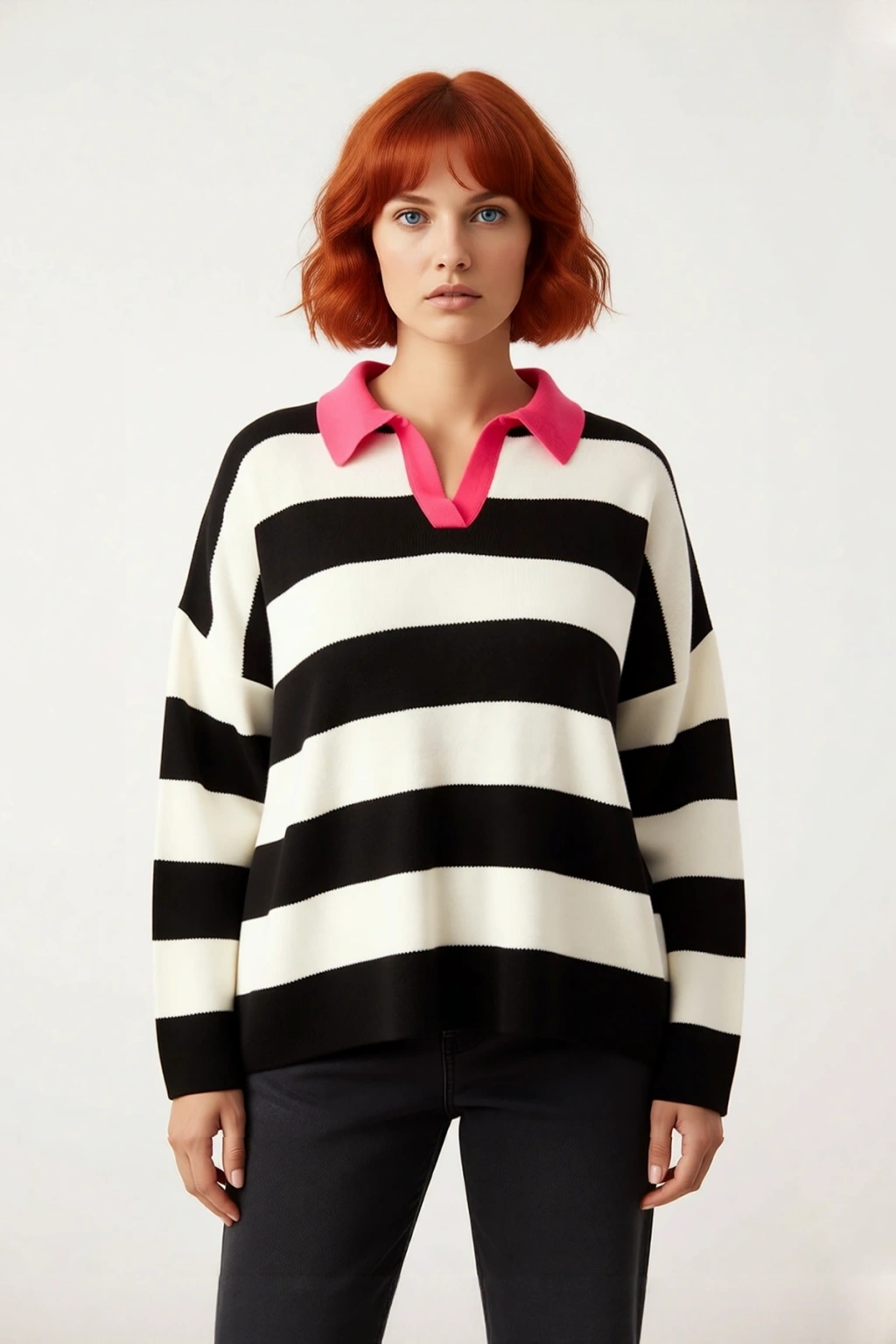 Ürün Özellikleri: Relaxed kalıp, akrilik materyal, çizgili desen, polo yaka, düşük kol, triko kumaş, çok renkli, baskısız tasarım.