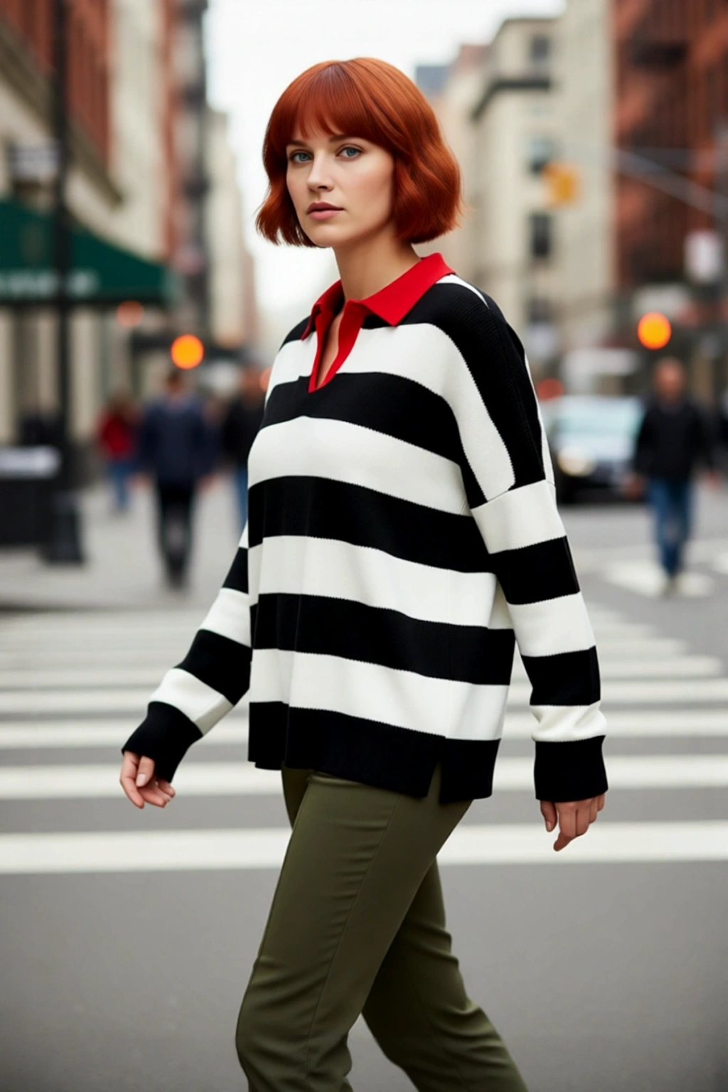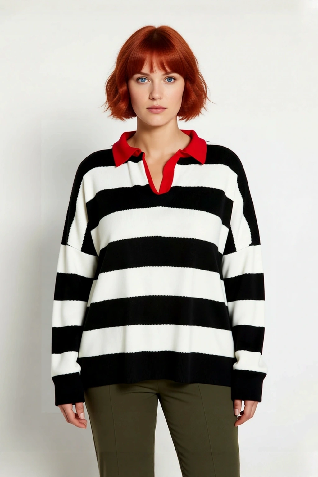 Bu Kadın Konforlu Rahat Kesim Polo Yaka Çizgili Triko Kazak, stil ve rahatlığı birleştirerek gardırobunuzun vazgeçilmezi olmaya hazır. 100% akrilik materyali sayesinde son derece yumuşak bir dokunuş sunarken, orta kalınlığı ile kış aylarında sizi sıcacık tutar. Kırmızı ve lacivert renklerin hakim olduğu çizgili deseni, canlı ve modern bir ifadeyle günlük şıklığınıza dinamizm katar. Çok renkli yapısıyla göz alıcı bir stil sergileyen bu kazak, baskısız tasarımıyla desenin doğal güzelliğini ön plana çıkarır.