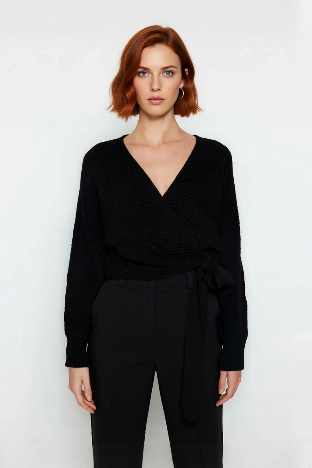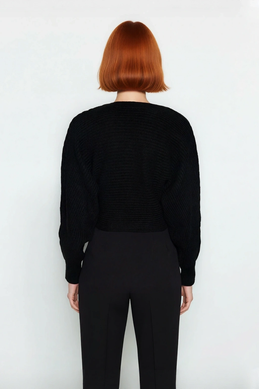 Ürün Özellikleri: Regular kalıp, akrilik materyal, düz desen, V yaka, standart kol, triko kumaş, siyah renk, cepsiz tasarım, crop boy, fitilli dokuma, kemersiz.