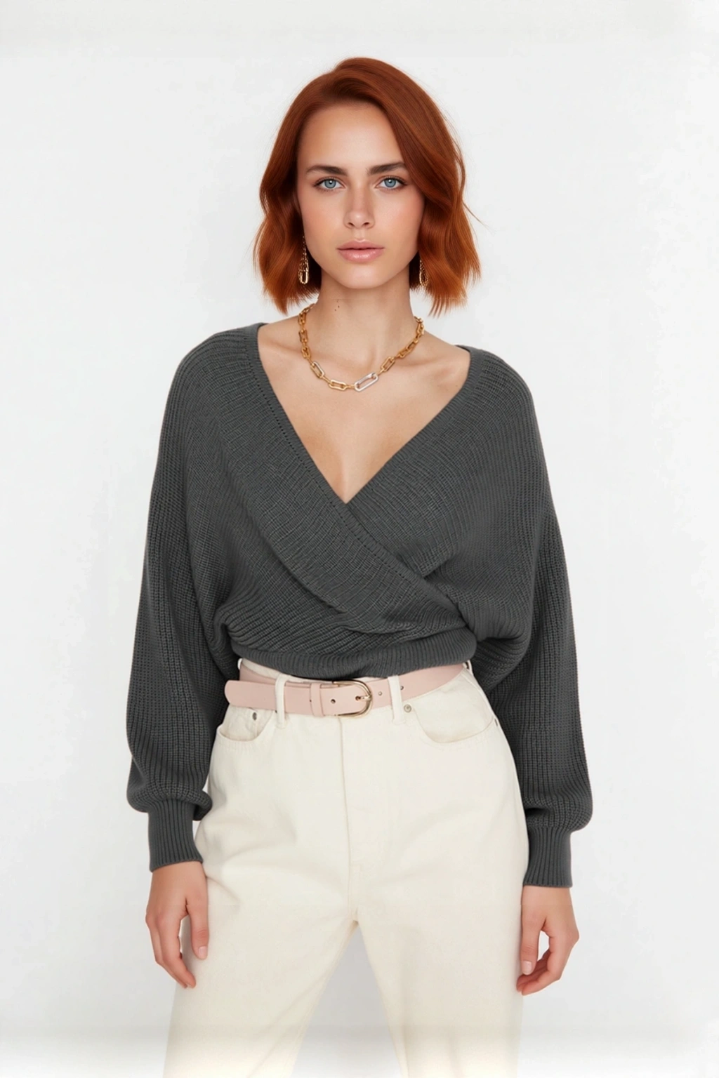 Bu zarif kadın triko kazak, kruvaze V yaka tasarımı ile modern ve çekici bir stil sunar. Regular kalıbı sayesinde vücuda rahatça oturarak gün boyu konfor ve hareket özgürlüğü sağlarken, %100 akrilik materyali kış aylarının soğuklarına karşı etkili bir koruma sunarak sizi sıcacık tutar. Düz deseni sade şıklığı ön plana çıkarırken, antrasit gri rengi her türlü kombinle kolayca uyum sağlar ve gardırobunuzun vazgeçilmez, zamansız parçası olmaya adaydır. Bu basic siluet, feminen bir dokunuşla her anınıza eşlik eder ve günlük kullanım için idealdir.