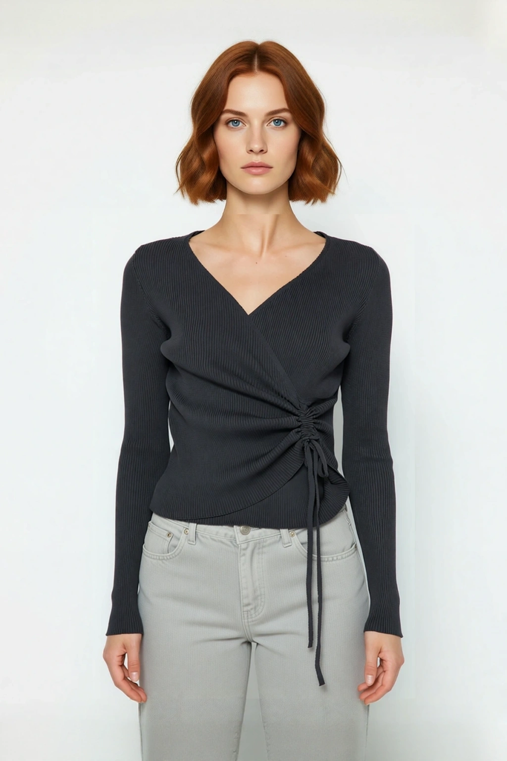 Bu zarif Kadın Kruvaze Yaka Bağcıklı Triko Üst, vücuda oturan fitted kalıbıyla modern ve feminen bir duruş sergiler. %100 polyester materyalden üretilen bu triko, hem yumuşak dokusuyla cilt dostu bir deneyim sunar hem de uzun ömürlü kullanımı garanti eder. Düz deseni ve antrasit gri rengi, minimalist bir şıklık arayanlar için idealdir. Yan kısmındaki ayarlanabilir bağcıklı büzgü detayı, ürüne benzersiz bir stil katarken, kişisel tercihinize göre şekillendirme imkanı sunar ve feminen çizgileri vurgular.