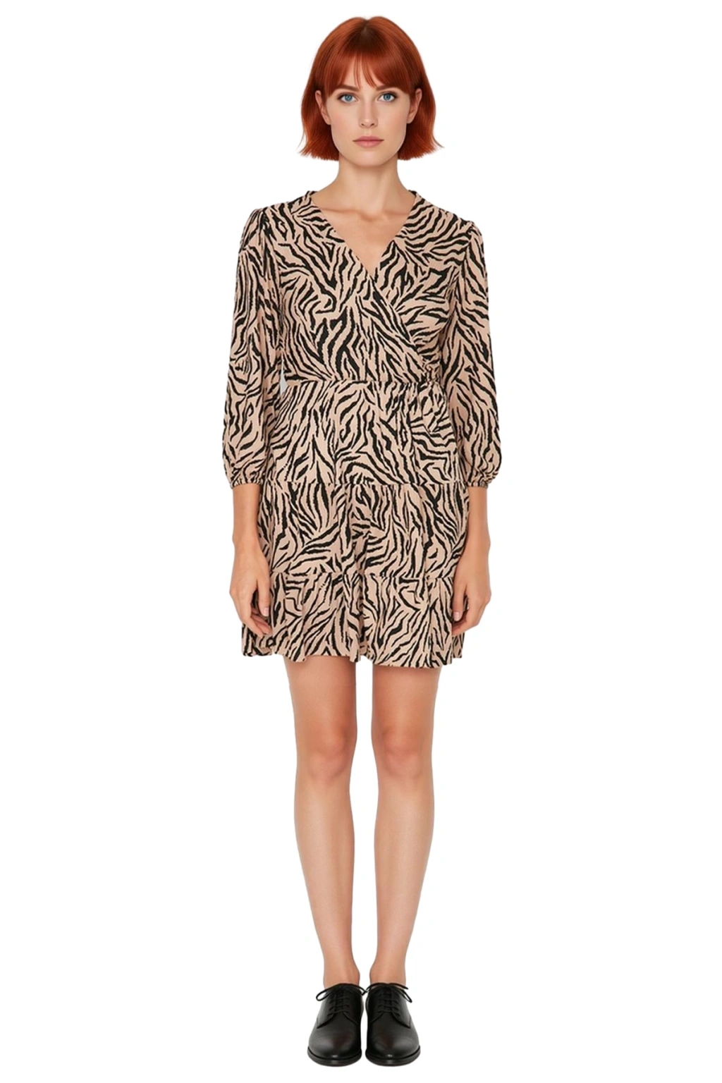 Ürün Özellikleri: Skater kalıp, polyester materyal, zebra desen, V yaka, truvakar balon kol, örme polyester kaşkorse kumaş, kahverengi zebra desenli renk.