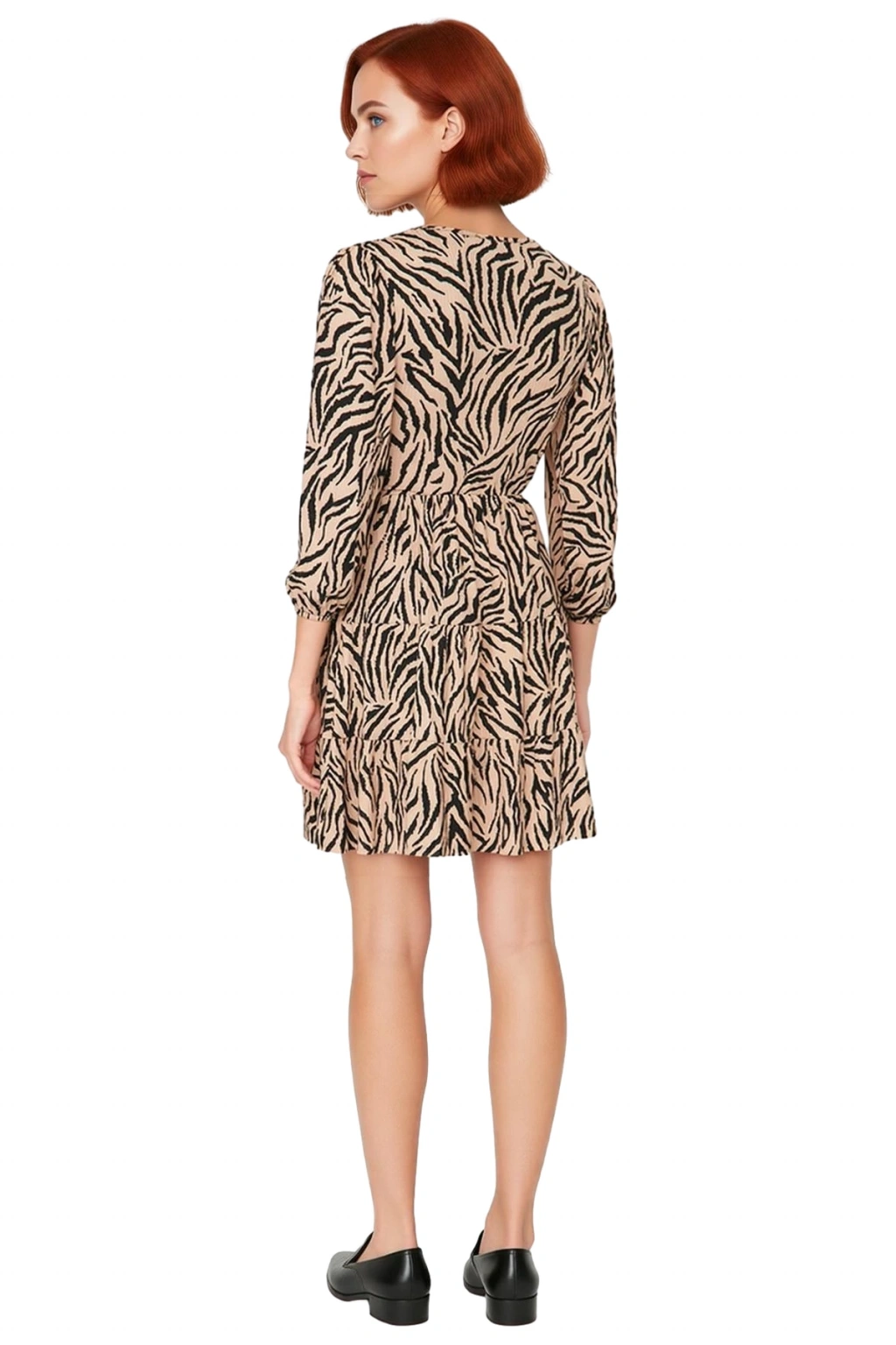 Ürün Özellikleri: Skater kalıp, polyester materyal, zebra desen, V yaka, truvakar balon kol, örme polyester kaşkorse kumaş, kahverengi zebra desenli renk.