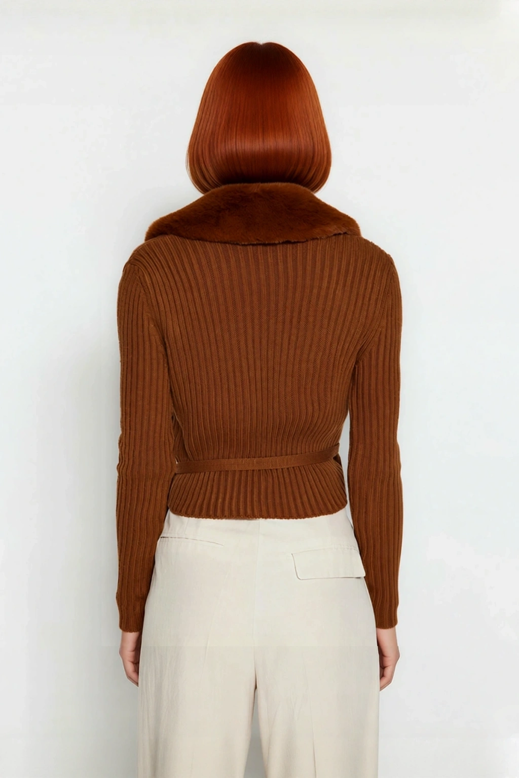 Ürün Özellikleri: Fitted kalıp, akrilik materyal, düz desen, kürklü yaka, standart kol, triko kumaş, kahverengi renk, bağcıklı tasarım.