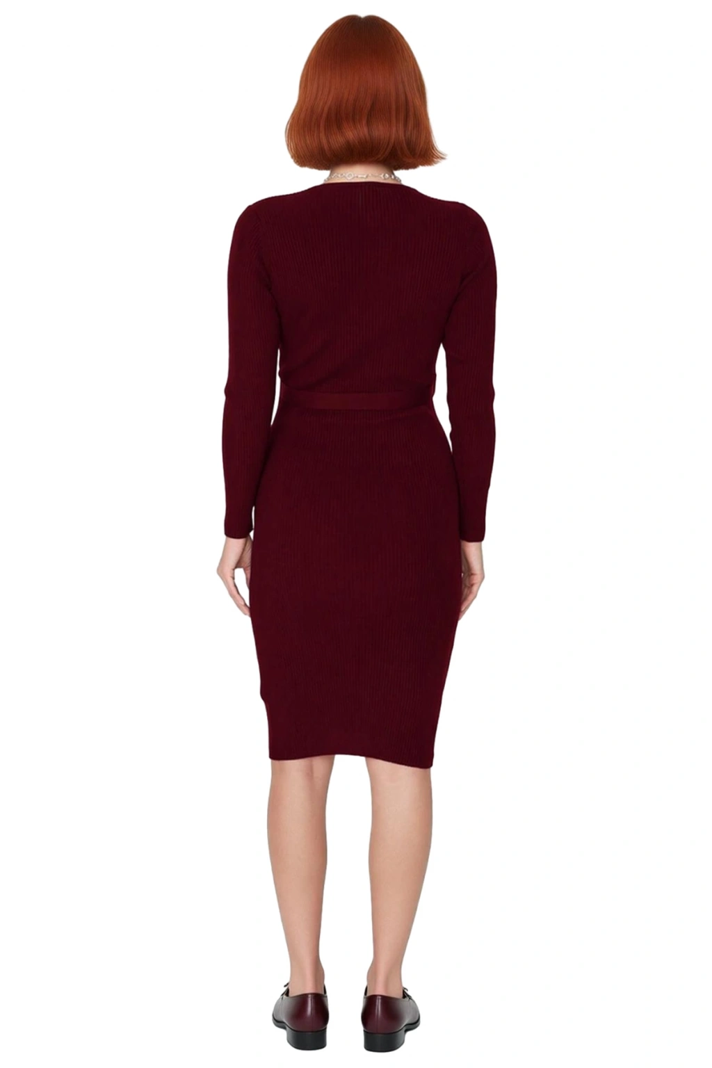 Ürün Özellikleri: Bodycon kalıp, akrilik materyal, düz desen, bisiklet yaka, standart kol, triko kumaş, bordo renk, kuşaklı kapama.