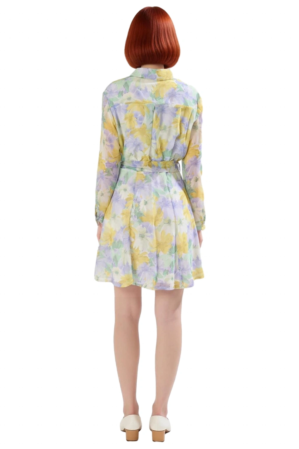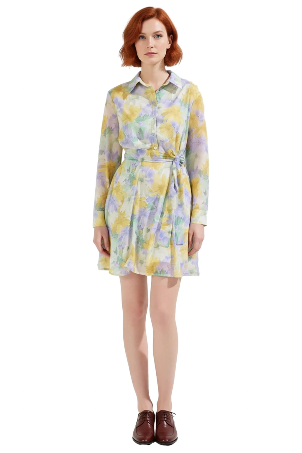 Ürün Özellikleri: Skater kalıp, polyester materyal, çiçekli desen, gömlek yaka, standart kol, şifon dokuma, çok renkli.