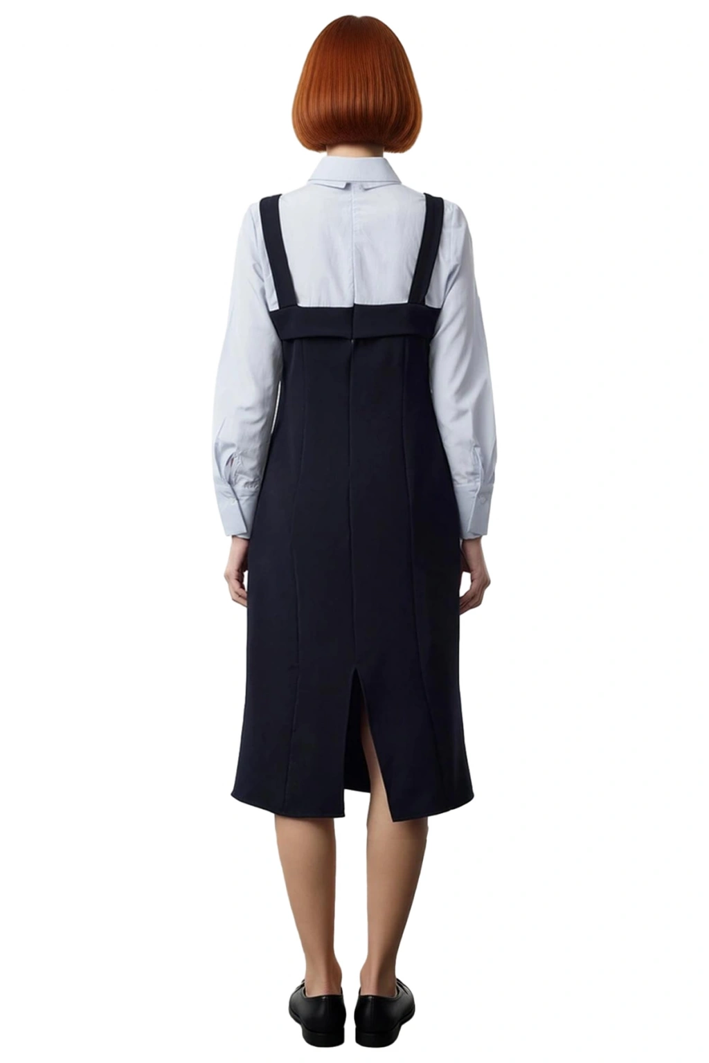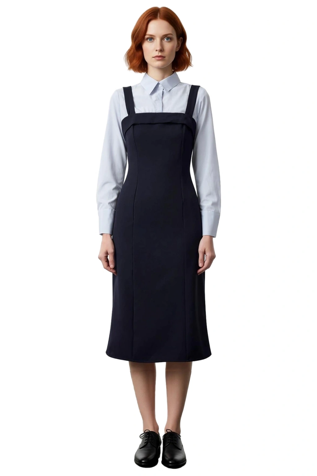 Bu lacivert kadın bodycon dokuma elbise, modern ve şık bir görünüm arayan kadınlar için özenle tasarlandı. Vücuda oturan bodycon kalıbı, feminen hatları zarifçe vurgulayarak mükemmel bir siluet sunar. Polyester karışımlı materyali, %88 polyester ve %12 elastan bileşimi sayesinde gün boyu konfor, esneklik ve hareket özgürlüğü sağlar. Düz deseni ile minimalist bir şıklık yakalayan bu elbise, içine giyilen çizgili gömlek yaka detayıyla klasik ve çağdaş tarzı bir araya getirir. Smart/Office ortamlarında profesyonel bir duruş sergilerken, Casual/Günlük kombinlerde de stil sahibi bir seçenek sunar.