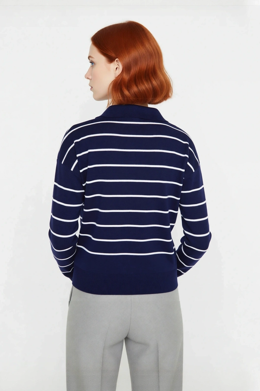 Ürün Özellikleri: Regular kalıp, %100 akrilik materyal, çizgili desen, polo yaka, uzun düşük kol, triko kumaş, lacivert renk, cepsiz tasarım.