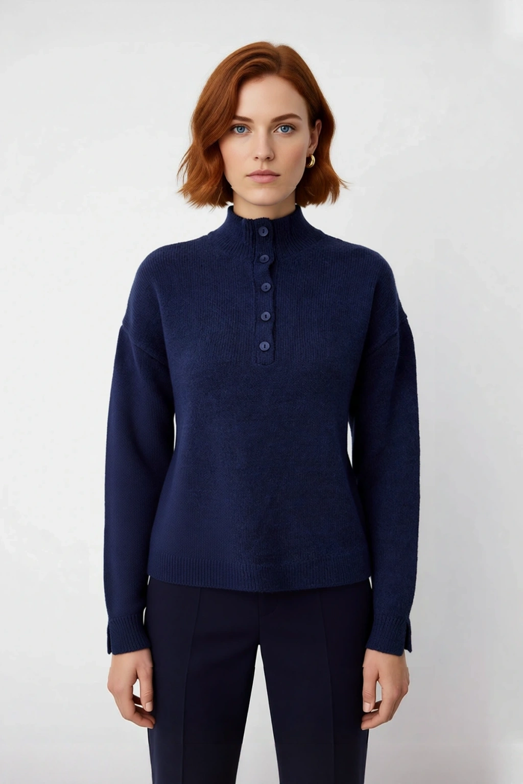Bu lacivert kadın triko kazak, regular kalıbı sayesinde vücudunuza nazikçe oturarak hem rahat hem de modern bir duruş sergiler. Yüksek kaliteli akrilik, polyester ve poliamid karışımı materyali, soğuk kış günlerinde bile size üst düzey sıcaklık ve konfor sunar. Düz deseniyle minimalist ve şık bir çizgi yakalarken, dik yaka ve önündeki sıra düğmeli tasarım, kazağa özgün ve stil sahibi bir dokunuş katar. Yumuşak dokusuyla cildinizle mükemmel bir uyum sağlayan bu kazak, günlük şıklığınızın vazgeçilmezi olmaya adaydır.