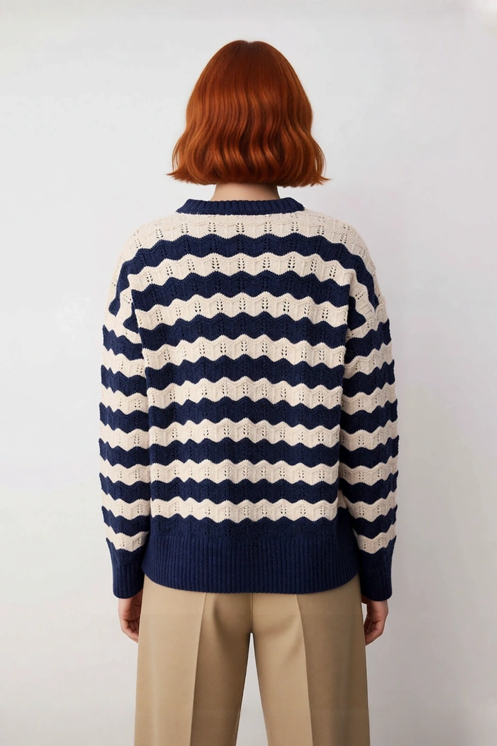 Ürün Özellikleri: Rahat kalıp, akrilik polyester poliamid materyal, dalgalı desen, bisiklet yaka, düşük kol, triko kumaş, lacivert ekru renk, uzun boy.