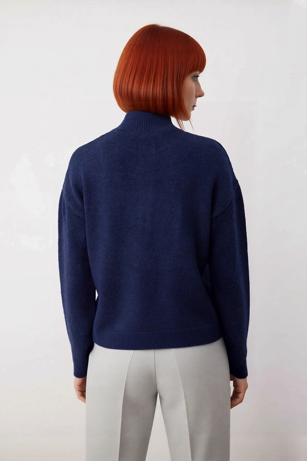 Ürün Özellikleri: Regular kalıp, akrilik materyal, düz desen, dik yaka, düşük kol, triko kumaş, lacivert renk.