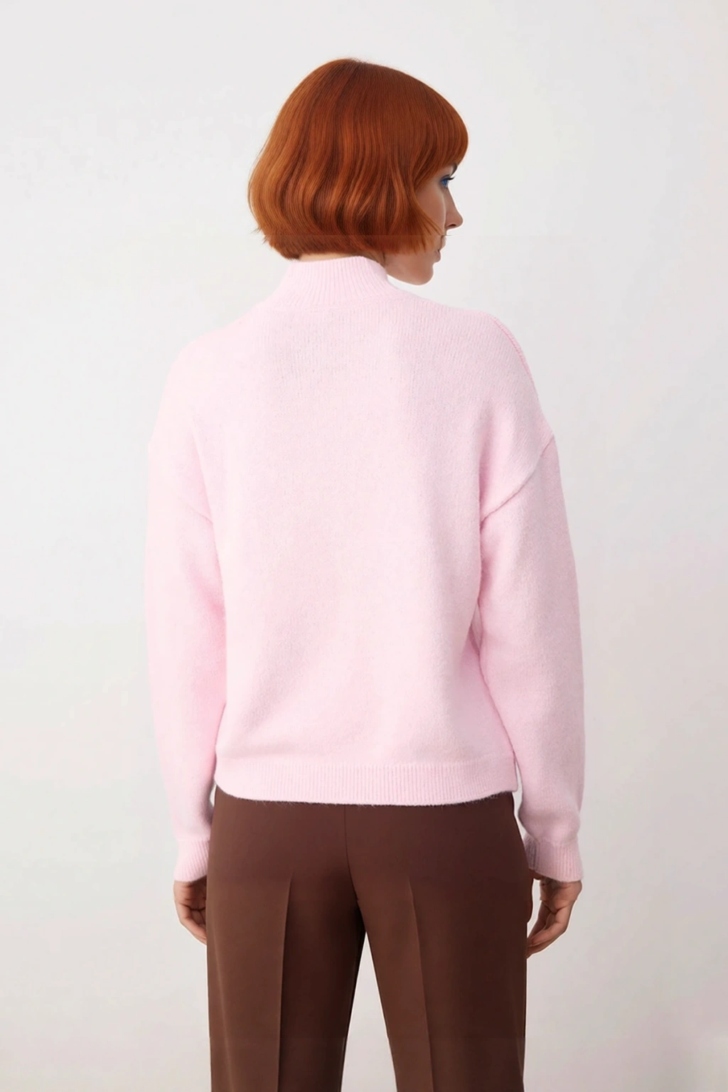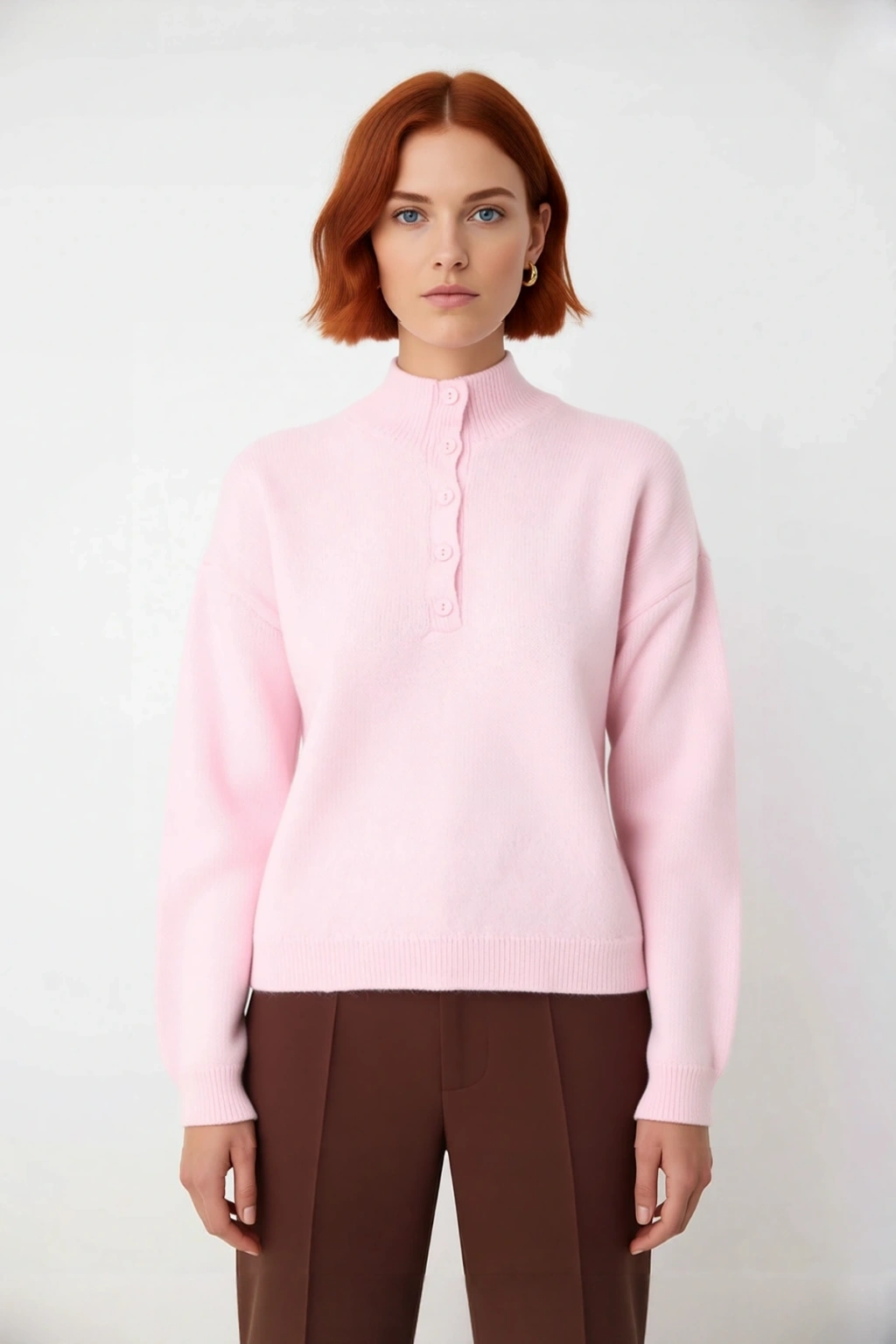 Yüksek ve dik yaka tasarımı, boynunuzu rüzgardan ve soğuktan korurken, aynı zamanda kazağa sofistike bir hava katar. Öndeki beş adet düğme, hem dekoratif bir unsur hem de pratik bir giyim detayıdır. Düşük kol yapısı, rahat bir duruş sağlarken, uzun kol boyu hareket özgürlüğünü destekler. Orta kalınlıktaki triko kumaşı, nefes alabilen yapısıyla dört mevsim geçişlerinde kullanıma uygunken, kış aylarında iç katman olarak idealdir. Tek plaka dokuma tekniğiyle üretilmesi, ürünün formunu uzun süre korumasını sağlar. Kolay bakımı (T41) sayesinde zamandan tasarruf ettirir.