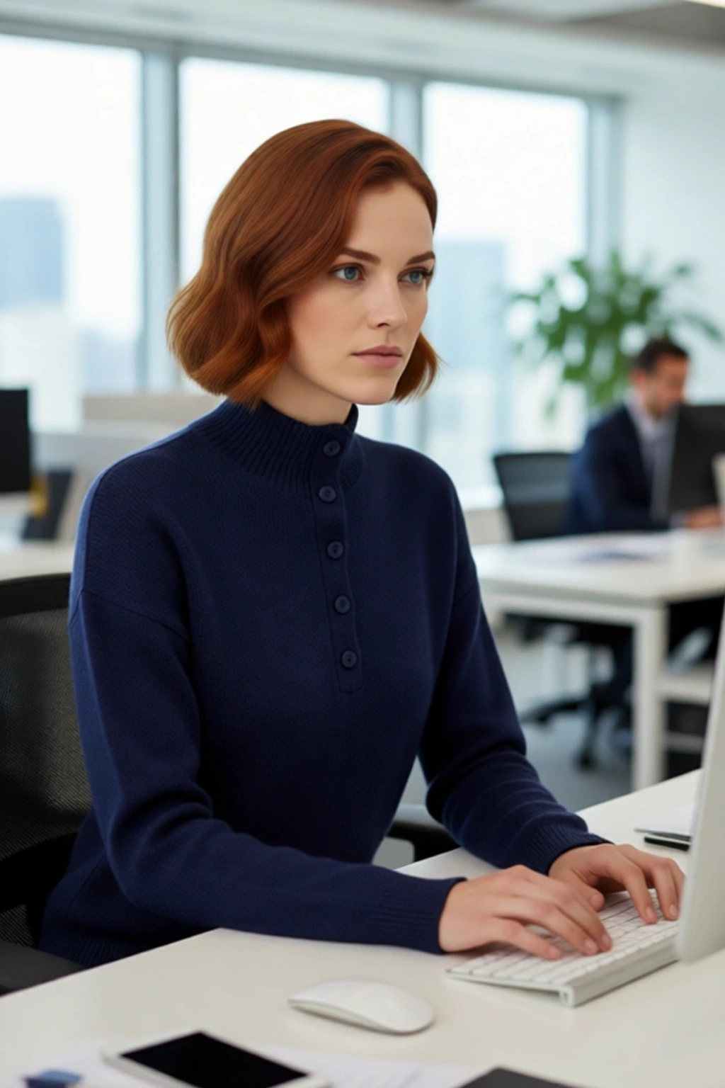 Bu lacivert kadın triko kazak, regular kesimi ile vücudunuza rahatça oturarak modern ve zarif bir görünüm sunar. Akrilik, polyester ve poliamid gibi kaliteli materyallerin harmanlanmasıyla üretilen bu kazak, soğuk günlerde sizi sıcacık tutarken, yumuşacık dokusuyla eşsiz bir konfor deneyimi yaşatır. Düz deseniyle sade ama etkileyici bir stil oluştururken, dik yaka ve önündeki şık düğmelerle karakter kazanır. Günlük şıklığınızı bir üst seviyeye taşımak isteyen kadınlar için mükemmel bir seçimdir.