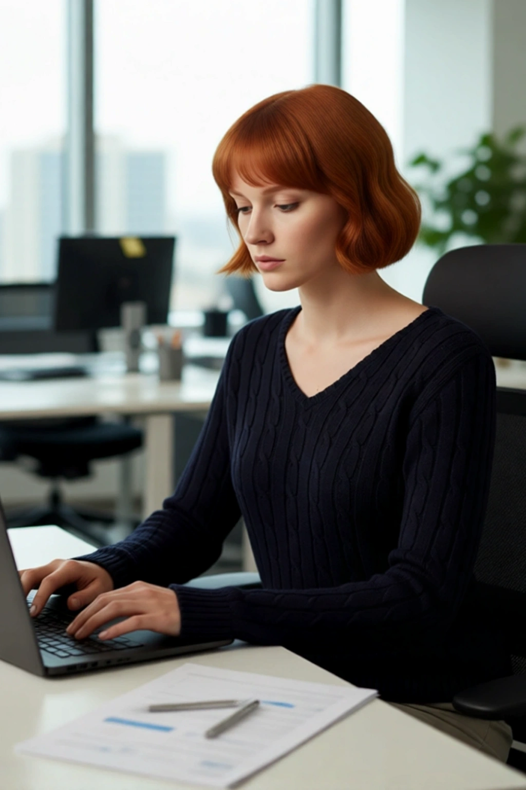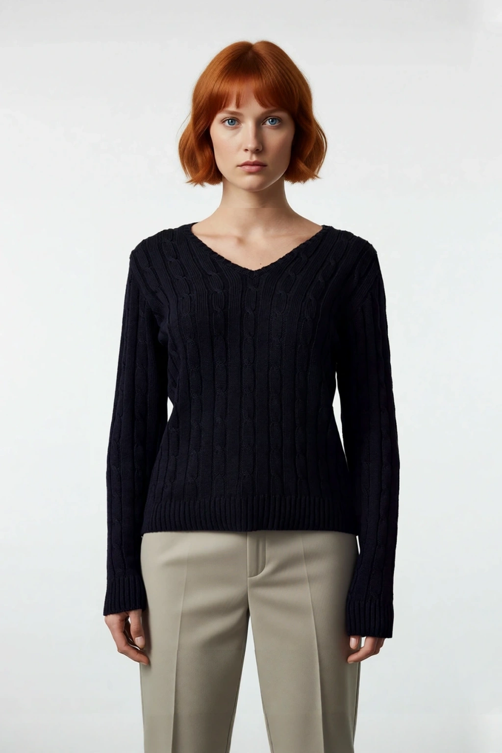Ürün Özellikleri: Regular kalıp, %50 Akrilik %50 Pamuk materyal, saç örgü desen, V yaka, standart kol, triko kumaş, lacivert renk, cepsiz.