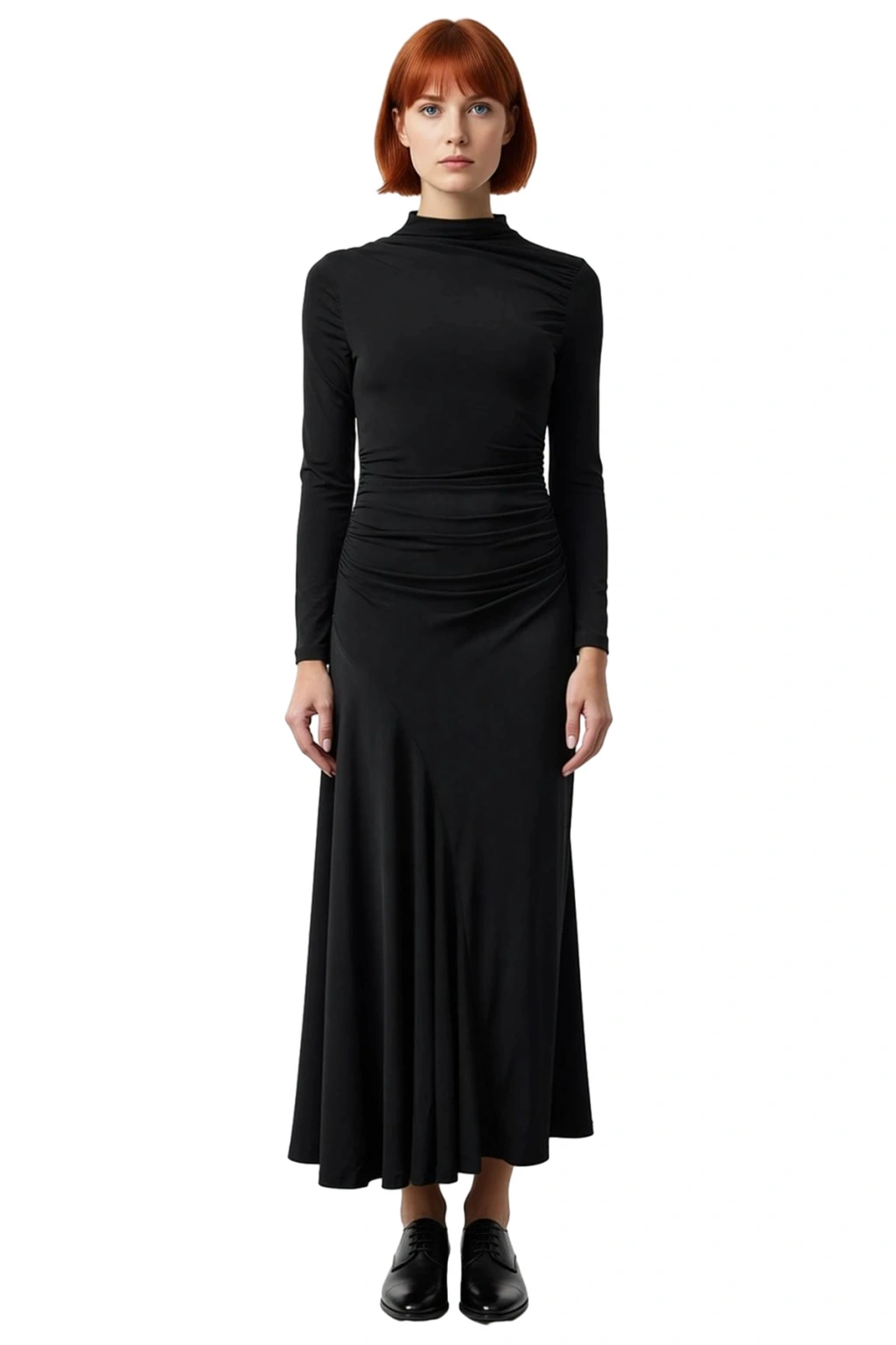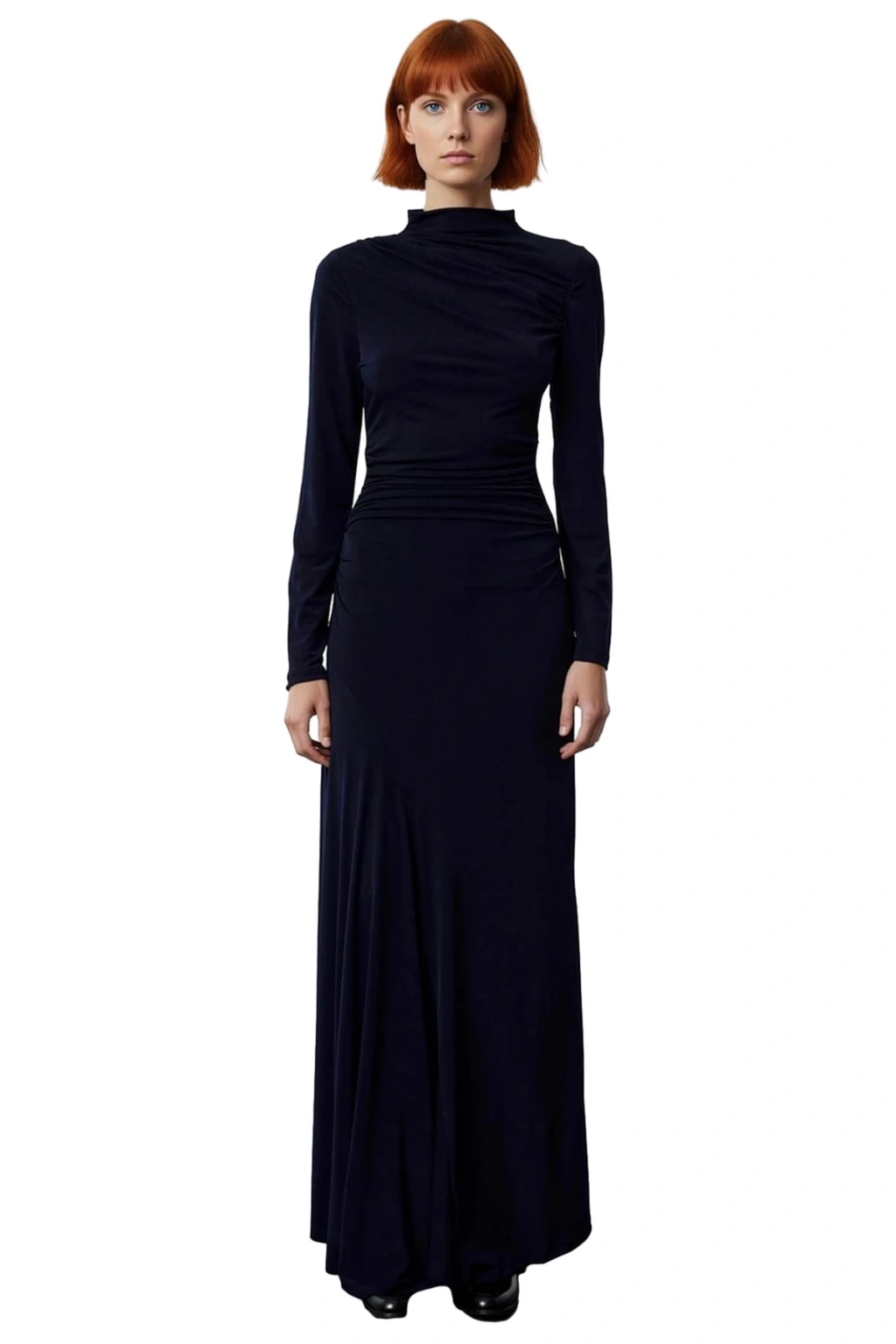 Ürün Özellikleri: Bodycon kalıp, polyester karışımlı materyal, düz desen, dik yaka, standart uzun kol, kalın sandy örme kumaş, lacivert renk, büzgü drape detaylı.