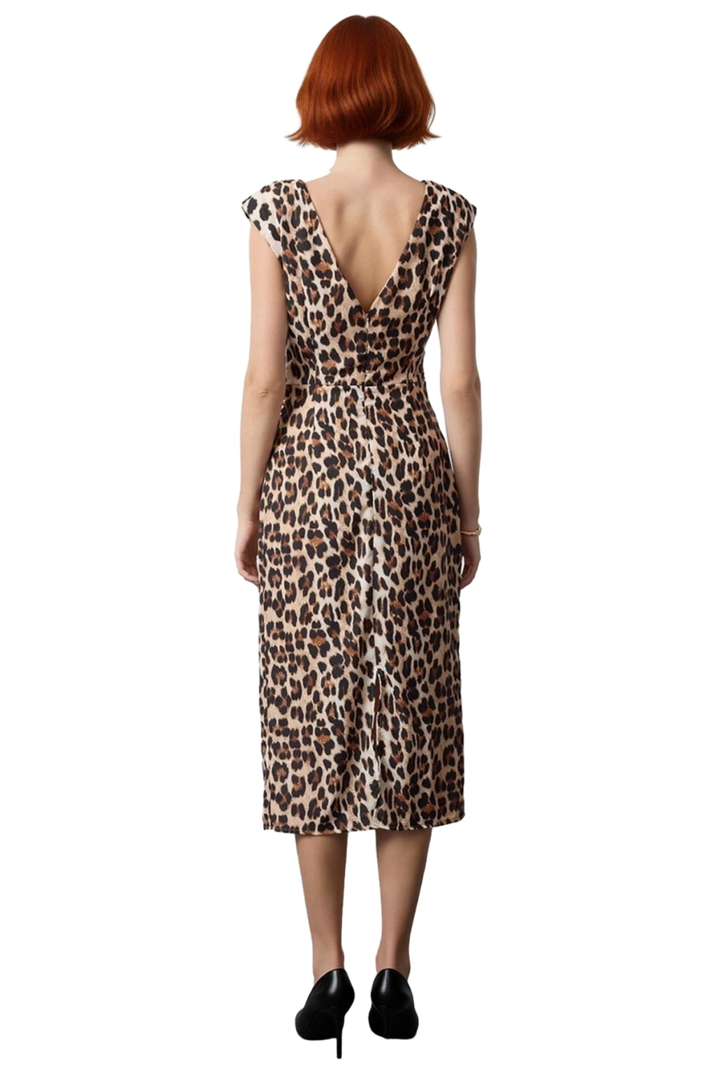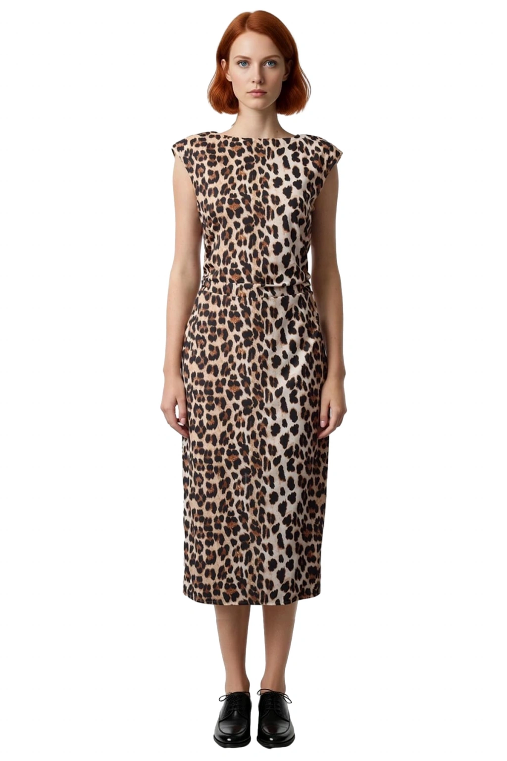 Ürün Özellikleri: Rahat kesim kalıp, %100 polyester materyal, leopar desen, bisiklet yaka, kolsuz, mat saten dokuma kumaş, kahverengi renk, astarlı tasarım.