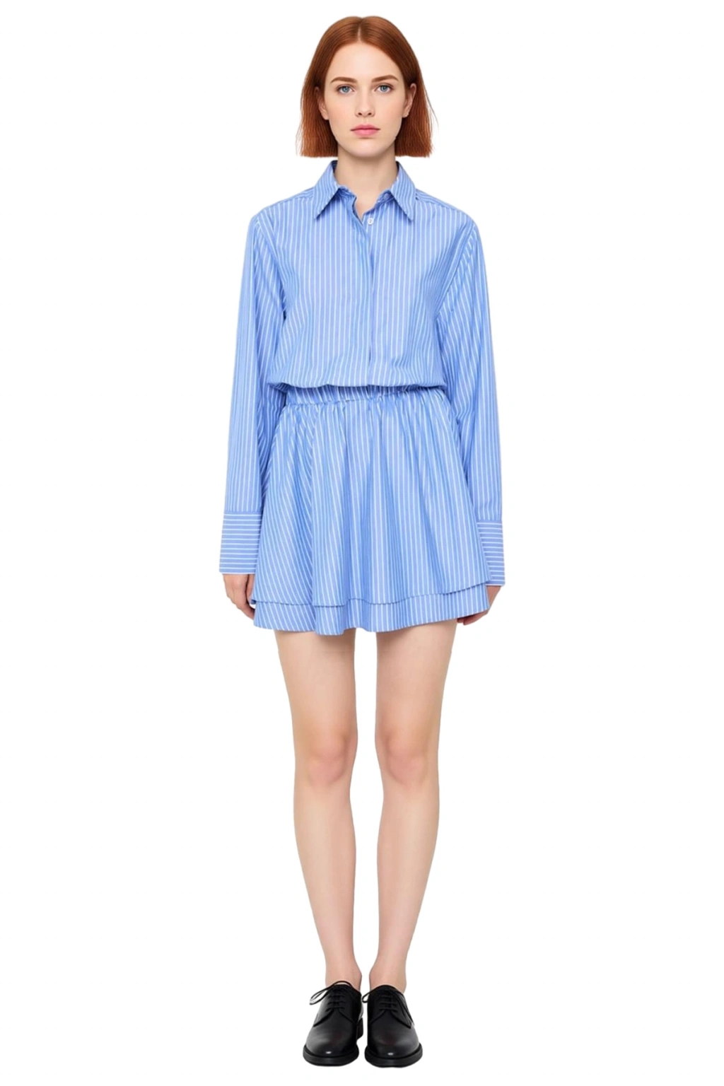 Ürün Özellikleri: Gömlek elbise kalıp, pamuk polyester karışımı, çizgili desen, gömlek yaka, düşük kol, uzun kol, poplin dokuma kumaş, mavi renk, mini boy, skater siluet, astarsız, bel lastik detaylı, yarım pat düğme kapama.