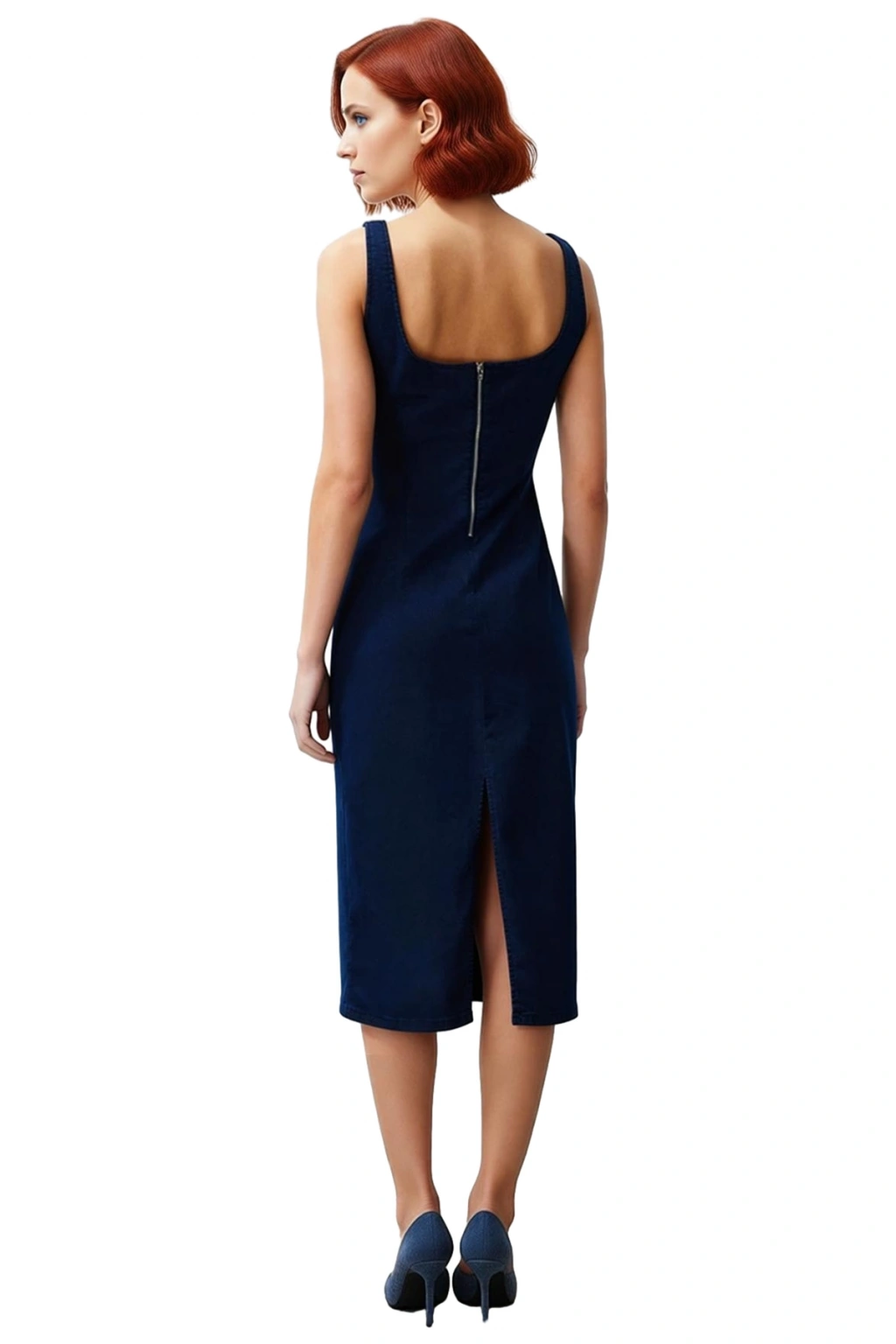 Ürün Özellikleri: Bodycon kalıp, denim materyal, düz desen, kare yaka, kolsuz, denim kumaş, mavi renk.