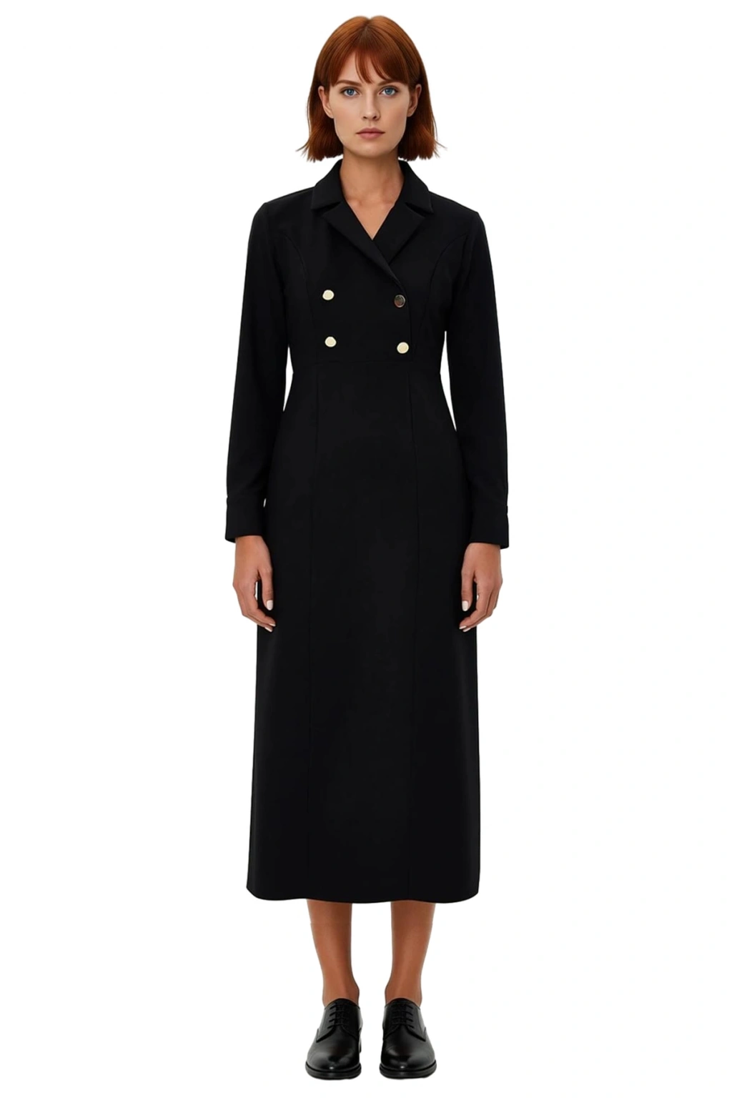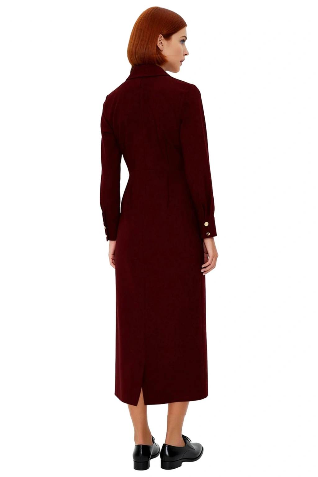 Kadınların zarafetini ön plana çıkaran bu modern dokuma elbise, kruvaze kesimiyle vücuda mükemmel bir uyum sağlar. Şık ceket yaka detayı, elbiseye sofistike bir hava katarken, düz deseniyle zamansız bir estetik sunar. Bordo renginin asil duruşu, altın renkli düğmelerle birleşerek göz alıcı bir stil yaratır. Maxi boyu sayesinde hem günlük kullanımda hem de özel anlarda rahatlıkla tercih edilebilir. Yüksek kaliteli polyester-elastan karışımı materyali, gün boyu konforlu bir deneyim vadederken, şıklığınızdan ödün vermemenizi sağlar.