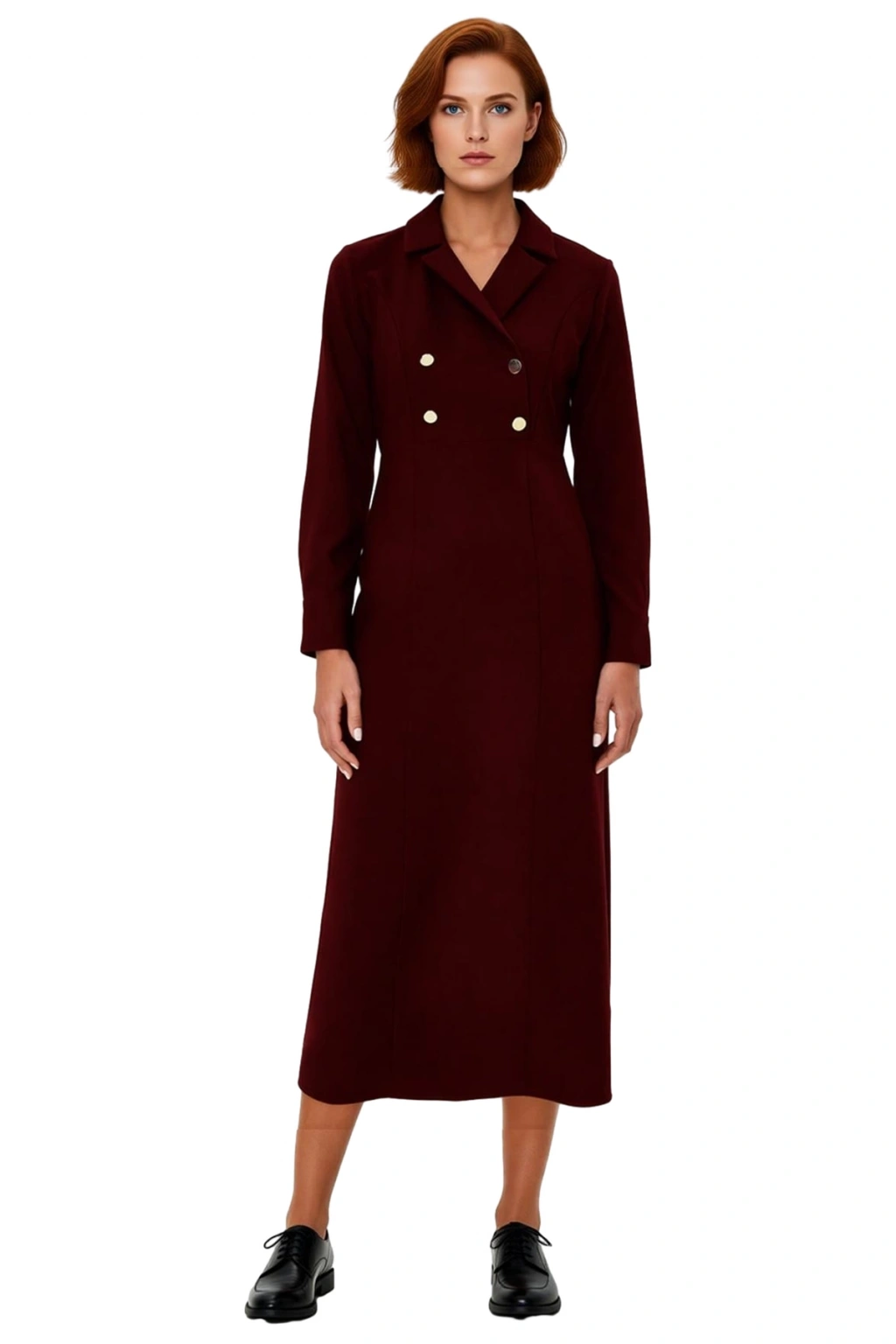 Bu kadın kruvaze elbise, sofistike tasarımı ve modern çizgileriyle dikkat çeker. Kruvaze kalıbı, vücut hatlarınıza nazikçe oturarak zarif bir siluet oluşturur. Ceket yaka detayı, profesyonel bir dokunuş katarken, düz deseni bordo renginin asaletiyle birleşerek zamansız bir şıklık sunar. Gold düğme detayları, elbiseye lüks bir hava katar ve maxi boyu, her ortamda kendinizi özel hissetmenizi sağlar. Dokuma kumaşın kalitesi sayesinde gün boyu rahatlık ve şıklığı bir arada yaşarsınız.