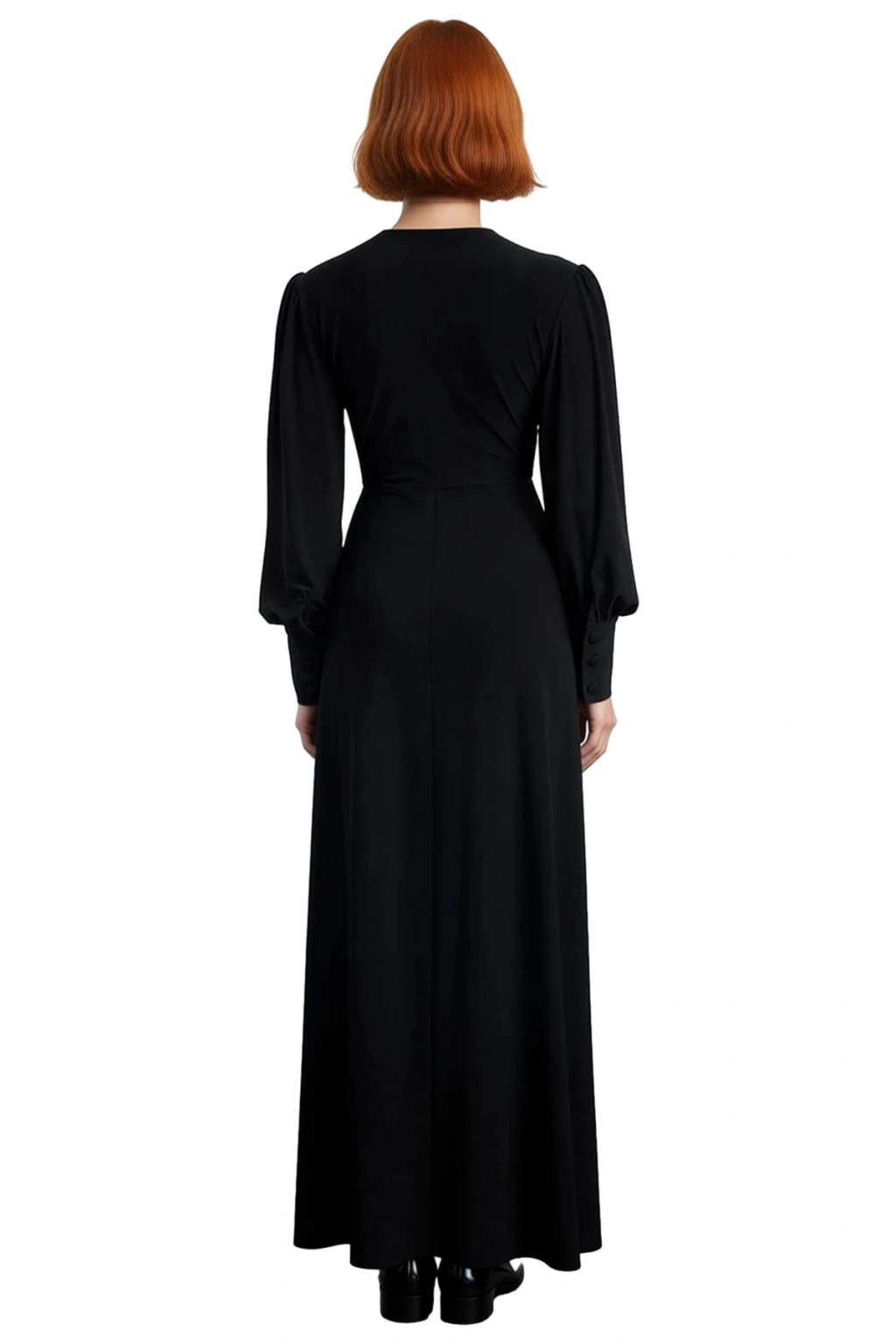 Ürün Özellikleri: Skater kalıp, polyester karışımlı materyal, düz desen, kruvaze yaka, balon kol, örme kumaş, siyah renk.